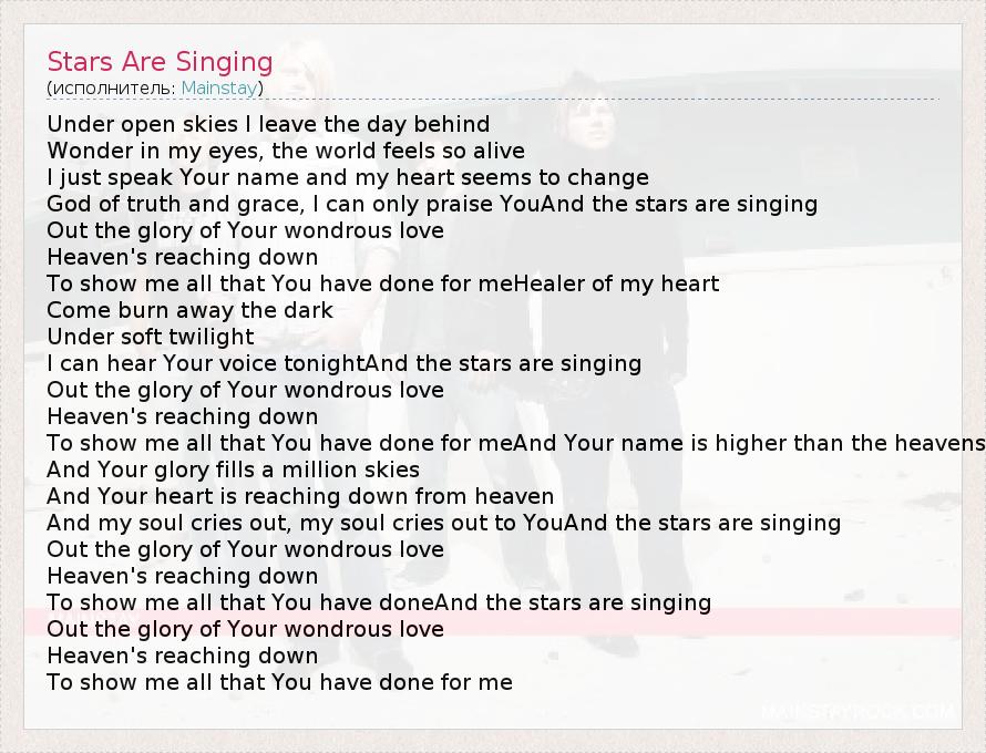 Under open skies I leave the day behind Wonder in my eyes, the world feels so alive I just speak Your name and my heart seems to change God of truth and grace, I can only praise YouAnd the stars are singing Out the glory of Your wondrous love Heaven's reaching down To show me all that You have done for meHealer of my heart Come burn away the dark Under soft twilight I can hear Your voice tonightAnd the stars are singing Out the glory of Your wondrous love Heaven's reaching down To show me all that You have done for meAnd Your name is higher than the heavens And Your glory fills a million skies And Your heart is reaching down from heaven And my soul cries out, my soul cries out to YouAnd the stars are singing Out the glory of Your wondrous love Heaven's reaching down To show me all that You have doneAnd the stars are singing Out the glory of Your wondrous love Heaven's reaching down To show me all that You have done for me