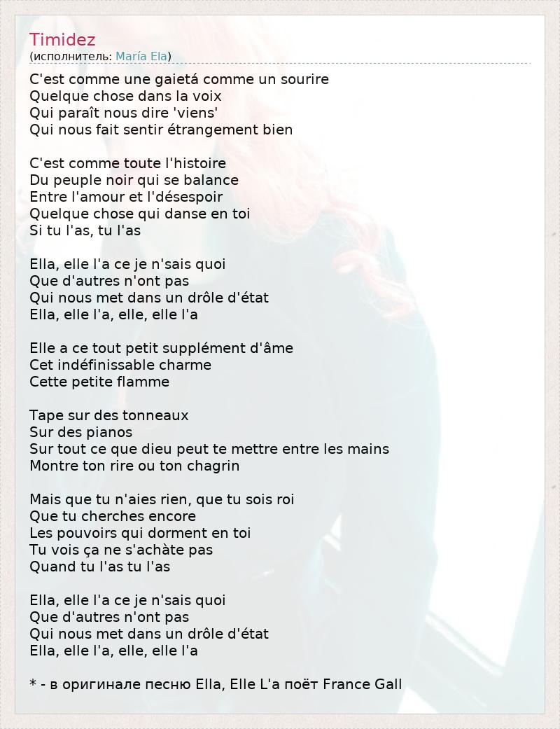 C'est comme une gaietá comme un sourire Quelque chose dans la voix Qui paraît nous dire 'viens' Qui nous fait sentir étrangement bien C'est comme toute l'histoire Du peuple noir qui se balance Entre l'amour et l'désespoir Quelque chose qui danse en toi Si tu l'as, tu l'as Ella, elle l'a ce je n'sais quoi Que d'autres n'ont pas Qui nous met dans un drôle d'état Ella, elle l'a, elle, elle l'a Elle a ce tout petit supplément d'âme Cet indéfinissable charme Cette petite flamme Tape sur des tonneaux Sur des pianos Sur tout ce que dieu peut te mettre entre les mains Montre ton rire ou ton chagrin Mais que tu n'aies rien, que tu sois roi Que tu cherches encore Les pouvoirs qui dorment en toi Tu vois ça ne s'achàte pas Quand tu l'as tu l'as Ella, elle l'a ce je n'sais quoi Que d'autres n'ont pas Qui nous met dans un drôle d'état Ella, elle l'a, elle, elle l'a * - в оригинале песню Ella, Elle L'a поёт France Gall
