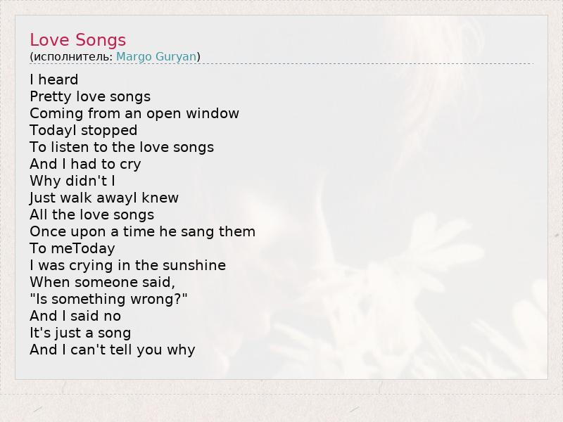 I heard Pretty love songs Coming from an open window TodayI stopped To listen to the love songs And I had to cry Why didn't I Just walk awayI knew All the love songs Once upon a time he sang them To meToday I was crying in the sunshine When someone said, "Is something wrong?" And I said no It's just a song And I can't tell you why