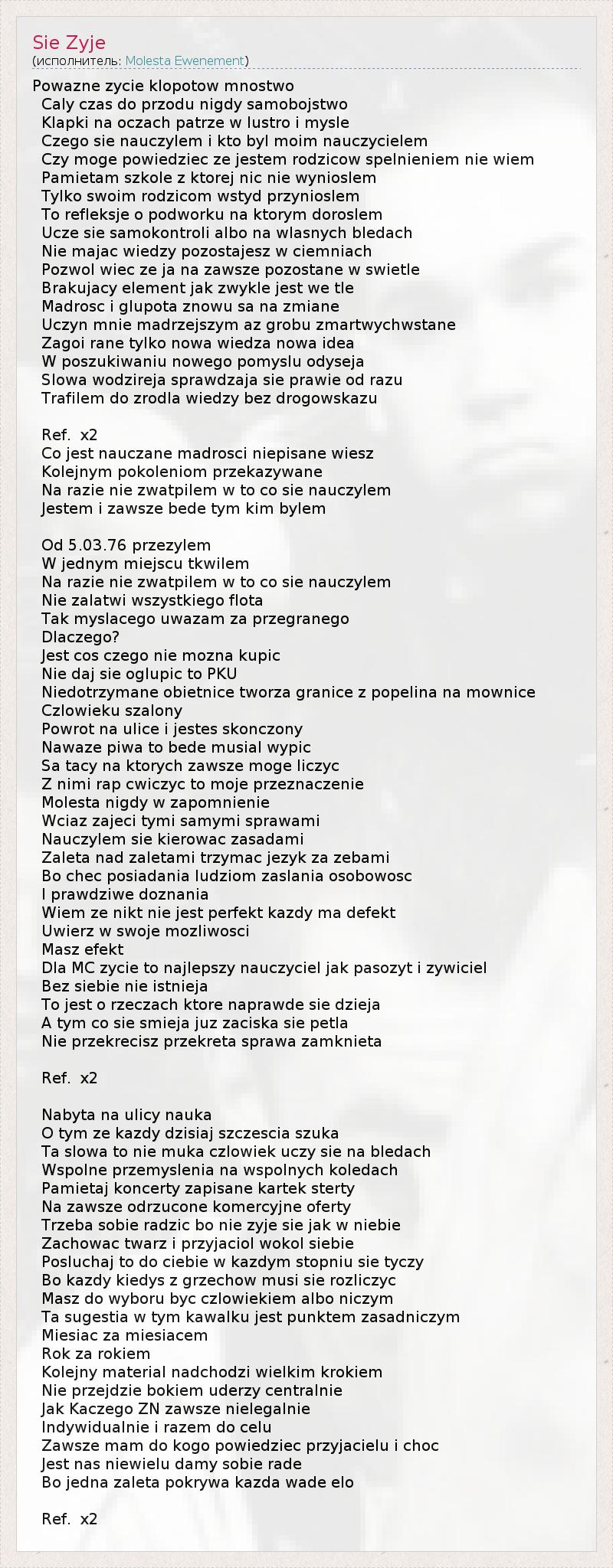 Powazne zycie klopotow mnostwo Caly czas do przodu nigdy samobojstwo Klapki na oczach patrze w lustro i mysle Czego sie nauczylem i kto byl moim nauczycielem Czy moge powiedziec ze jestem rodzicow spelnieniem nie wiem Pamietam szkole z ktorej nic nie wynioslem Tylko swoim rodzicom wstyd przynioslem To refleksje o podworku na ktorym doroslem Ucze sie samokontroli albo na wlasnych bledach Nie majac wiedzy pozostajesz w ciemniach Pozwol wiec ze ja na zawsze pozostane w swietle Brakujacy element jak zwykle jest we tle Madrosc i glupota znowu sa na zmiane Uczyn mnie madrzejszym az grobu zmartwychwstane Zagoi rane tylko nowa wiedza nowa idea W poszukiwaniu nowego pomyslu odyseja Slowa wodzireja sprawdzaja sie prawie od razu Trafilem do zrodla wiedzy bez drogowskazu Ref. x2 Co jest nauczane madrosci niepisane wiesz Kolejnym pokoleniom przekazywane Na razie nie zwatpilem w to co sie nauczylem Jestem i zawsze bede tym kim bylem Od 5.03.76 przezylem W jednym miejscu tkwilem Na razie nie zwatpilem w to co sie nauczylem Nie zalatwi wszystkiego flota Tak myslacego uwazam za przegranego Dlaczego? Jest cos czego nie mozna kupic Nie daj sie oglupic to PKU Niedotrzymane obietnice tworza granice z popelina na mownice Czlowieku szalony Powrot na ulice i jestes skonczony Nawaze piwa to bede musial wypic Sa tacy na ktorych zawsze moge liczyc Z nimi rap cwiczyc to moje przeznaczenie Molesta nigdy w zapomnienie Wciaz zajeci tymi samymi sprawami Nauczylem sie kierowac zasadami Zaleta nad zaletami trzymac jezyk za zebami Bo chec posiadania ludziom zaslania osobowosc I prawdziwe doznania Wiem ze nikt nie jest perfekt kazdy ma defekt Uwierz w swoje mozliwosci Masz efekt Dla MC zycie to najlepszy nauczyciel jak pasozyt i zywiciel Bez siebie nie istnieja To jest o rzeczach ktore naprawde sie dzieja A tym co sie smieja juz zaciska sie petla Nie przekrecisz przekreta sprawa zamknieta Ref. x2 Nabyta na ulicy nauka O tym ze kazdy dzisiaj szczescia szuka Ta slowa to nie muka czlowiek uczy sie na bledach Wspolne przemyslenia na wspolnych koledach Pamietaj koncerty zapisane kartek sterty Na zawsze odrzucone komercyjne oferty Trzeba sobie radzic bo nie zyje sie jak w niebie Zachowac twarz i przyjaciol wokol siebie Posluchaj to do ciebie w kazdym stopniu sie tyczy Bo kazdy kiedys z grzechow musi sie rozliczyc Masz do wyboru byc czlowiekiem albo niczym Ta sugestia w tym kawalku jest punktem zasadniczym Miesiac za miesiacem Rok za rokiem Kolejny material nadchodzi wielkim krokiem Nie przejdzie bokiem uderzy centralnie Jak Kaczego ZN zawsze nielegalnie Indywidualnie i razem do celu Zawsze mam do kogo powiedziec przyjacielu i choc Jest nas niewielu damy sobie rade Bo jedna zaleta pokrywa kazda wade elo Ref. x2
