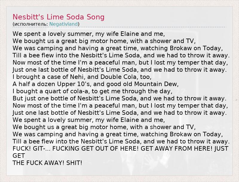 А как ты думаешь, о чем песня "Nesbitt's Lime Soda Song" ?