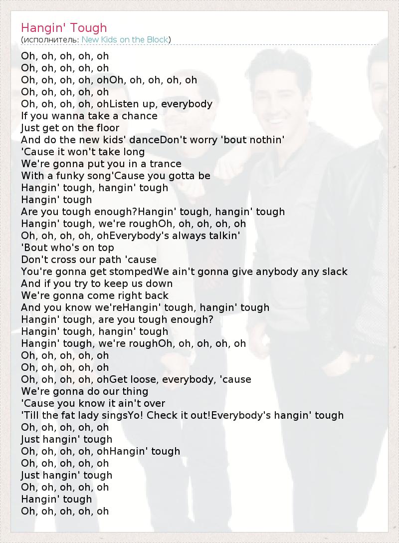 Oh, oh, oh, oh, oh Oh, oh, oh, oh, oh Oh, oh, oh, oh, ohOh, oh, oh, oh, oh Oh, oh, oh, oh, oh Oh, oh, oh, oh, ohListen up, everybody If you wanna take a chance Just get on the floor And do the new kids' danceDon't worry 'bout nothin' 'Cause it won't take long We're gonna put you in a trance With a funky song'Cause you gotta be Hangin' tough, hangin' tough Hangin' tough Are you tough enough?Hangin' tough, hangin' tough Hangin' tough, we're roughOh, oh, oh, oh, oh Oh, oh, oh, oh, ohEverybody's always talkin' 'Bout who's on top Don't cross our path 'cause You're gonna get stompedWe ain't gonna give anybody any slack And if you try to keep us down We're gonna come right back And you know we'reHangin' tough, hangin' tough Hangin' tough, are you tough enough? Hangin' tough, hangin' tough Hangin' tough, we're roughOh, oh, oh, oh, oh Oh, oh, oh, oh, oh Oh, oh, oh, oh, oh Oh, oh, oh, oh, ohGet loose, everybody, 'cause We're gonna do our thing 'Cause you know it ain't over 'Till the fat lady singsYo! Check it out!Everybody's hangin' tough Oh, oh, oh, oh, oh Just hangin' tough Oh, oh, oh, oh, ohHangin' tough Oh, oh, oh, oh, oh Just hangin' tough Oh, oh, oh, oh, oh Hangin' tough Oh, oh, oh, oh, oh
