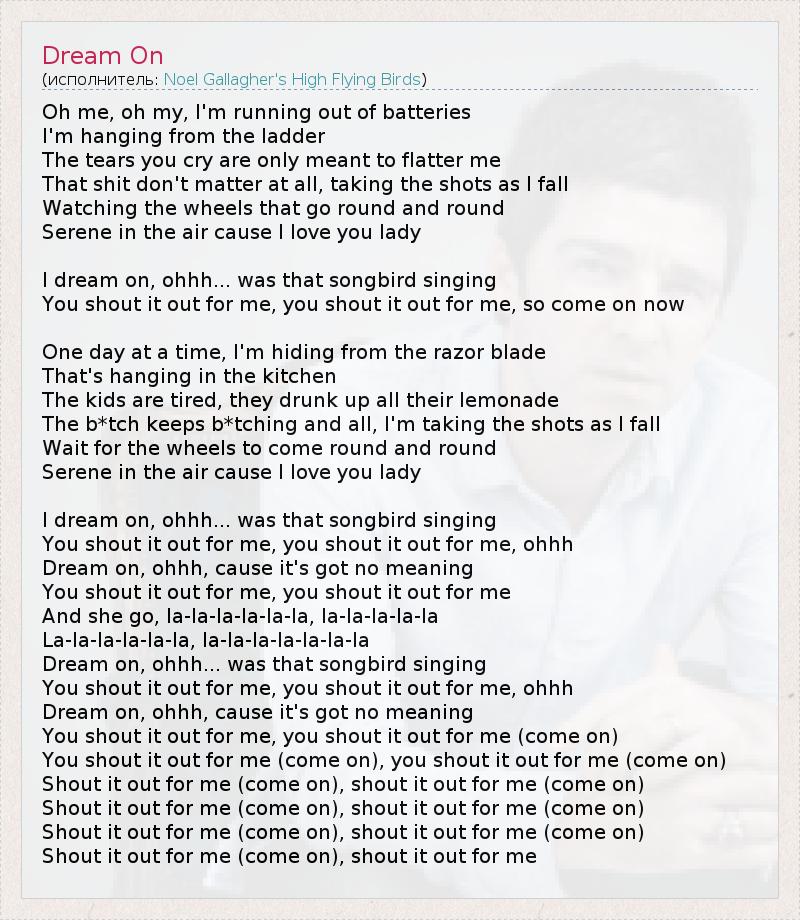 Oh me, oh my, I'm running out of batteries I'm hanging from the ladder The tears you cry are only meant to flatter me That shit don't matter at all, taking the shots as I fall Watching the wheels that go round and round Serene in the air cause I love you lady I dream on, ohhh... was that songbird singing You shout it out for me, you shout it out for me, so come on now One day at a time, I'm hiding from the razor blade That's hanging in the kitchen The kids are tired, they drunk up all their lemonade The b*tch keeps b*tching and all, I'm taking the shots as I fall Wait for the wheels to come round and round Serene in the air cause I love you lady I dream on, ohhh... was that songbird singing You shout it out for me, you shout it out for me, ohhh Dream on, ohhh, cause it's got no meaning You shout it out for me, you shout it out for me And she go, la-la-la-la-la-la, la-la-la-la-la La-la-la-la-la-la, la-la-la-la-la-la-la Dream on, ohhh... was that songbird singing You shout it out for me, you shout it out for me, ohhh Dream on, ohhh, cause it's got no meaning You shout it out for me, you shout it out for me (come on) You shout it out for me (come on), you shout it out for me (come on) Shout it out for me (come on), shout it out for me (come on) Shout it out for me (come on), shout it out for me (come on) Shout it out for me (come on), shout it out for me (come on) Shout it out for me (come on), shout it out for me