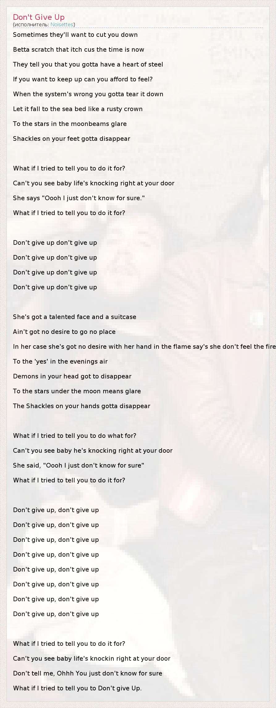 Sometimes they'll want to cut you down Betta scratch that itch cus the time is now They tell you that you gotta have a heart of steel If you want to keep up can you afford to feel? When the system's wrong you gotta tear it down Let it fall to the sea bed like a rusty crown To the stars in the moonbeams glare Shackles on your feet gotta disappear What if I tried to tell you to do it for? Can't you see baby life's knocking right at your door She says "Oooh I just don't know for sure." What if I tried to tell you to do it for? Don't give up don't give up Don't give up don't give up Don't give up don't give up Don't give up don't give up She's got a talented face and a suitcase Ain't got no desire to go no place In her case she's got no desire with her hand in the flame say's she don't feel the fire To the 'yes' in the evenings air Demons in your head got to disappear To the stars under the moon means glare The Shackles on your hands gotta disappear What if I tried to tell you to do what for? Can't you see baby he's knocking right at your door She said, "Oooh I just don't know for sure" What if I tried to tell you to do it for? Don't give up, don't give up Don't give up, don't give up Don't give up, don't give up Don't give up, don't give up Don't give up, don't give up Don't give up, don't give up Don't give up, don't give up Don't give up, don't give up What if I tried to tell you to do it for? Can't you see baby life's knockin right at your door Don't tell me, Ohhh You just don't know for sure What if I tried to tell you to Don't give Up.