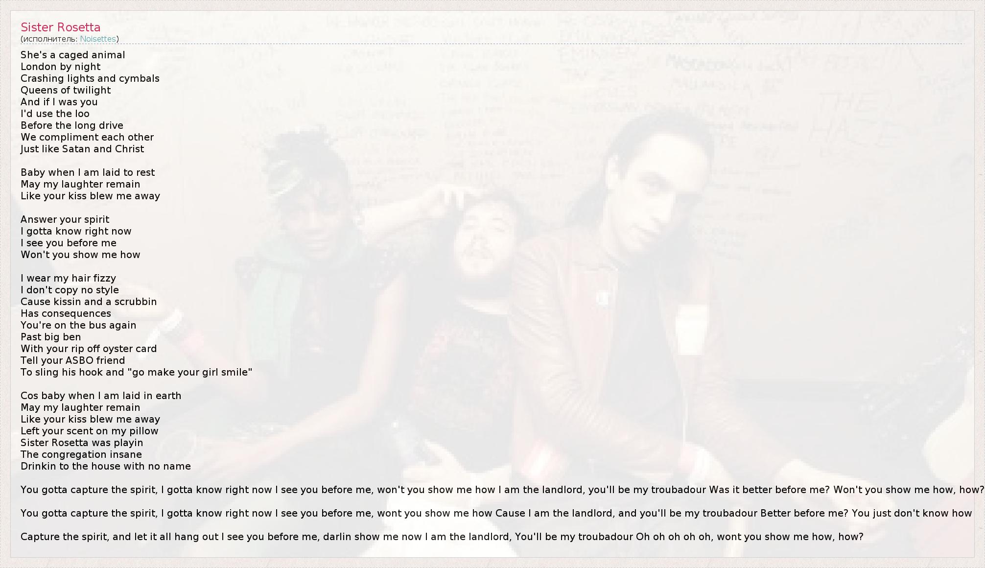 She's a caged animal London by night Crashing lights and cymbals Queens of twilight And if I was you I'd use the loo Before the long drive We compliment each other Just like Satan and Christ Baby when I am laid to rest May my laughter remain Like your kiss blew me away Answer your spirit I gotta know right now I see you before me Won't you show me how I wear my hair fizzy I don't copy no style Cause kissin and a scrubbin Has consequences You're on the bus again Past big ben With your rip off oyster card Tell your ASBO friend To sling his hook and "go make your girl smile" Cos baby when I am laid in earth May my laughter remain Like your kiss blew me away Left your scent on my pillow Sister Rosetta was playin The congregation insane Drinkin to the house with no name You gotta capture the spirit, I gotta know right now I see you before me, won't you show me how I am the landlord, you'll be my troubadour Was it better before me? Won't you show me how, how? You gotta capture the spirit, I gotta know right now I see you before me, wont you show me how Cause I am the landlord, and you'll be my troubadour Better before me? You just don't know how Capture the spirit, and let it all hang out I see you before me, darlin show me now I am the landlord, You'll be my troubadour Oh oh oh oh oh, wont you show me how, how?