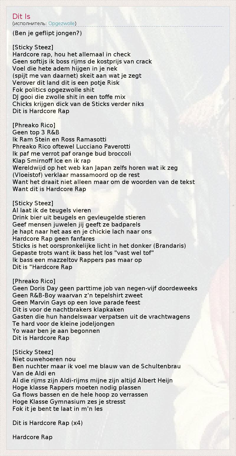 (Ben je geflipt jongen?) [Sticky Steez] Hardcore rap, hou het allemaal in check Geen softijs ik boss rijms de kostprijs van crack Voel die hete adem hijgen in je nek (spijt me van daarnet) skeit aan wat je zegt Verover dit land dit is een potje Risk Fok politics opgezwolle shit DJ gooi die zwolle shit in een toffe mix Chicks krijgen dick van de Sticks verder niks Dit is Hardcore Rap [Phreako Rico] Geen top 3 R&B Ik Ram Stein en Ross Ramasotti Phreako Rico oftewel Lucciano Paverotti Ik paf me verrot paf orange bud broccoli Klap Smirnoff Ice en ik rap Wereldwijd op het web kan Japan zelfs horen wat ik zeg (Vloeistof) verklaar massamoord op de rest Want het draait niet alleen maar om de woorden van de tekst Want dit is Hardcore Rap [Sticky Steez] Al laat ik de teugels vieren Drink bier uit beugels en gevleugelde stieren Geef mensen juwelen jij geeft ze badparels Je hapt naar het aas en je chickie lach naar ons Hardcore Rap geen fanfares Sticks is het oorspronkelijke licht in het donker (Brandaris) Gepaste trots want ik bass het los "vast wel tof" Ik bass een mazzeltov Rappers pas maar op Dit is "Hardcore Rap [Phreako Rico] Geen Doris Day geen parttime job van negen-vijf doordeweeks Geen R&B-Boy waarvan z'n tepelshirt zweet Geen Marvin Gays op een love parade feest Dit is voor de nachtbrakers klapkaken Gasten die hun handelswaar verpatsen uit de vrachtwagens Te hard voor de kleine jodeljongen Yo waar ben je aan begonnen Dit is Hardcore Rap [Sticky Steez] Niet ouwehoeren nou Ben nuchter maar ik voel me blauw van de Schultenbrau Van de Aldi en Al die rijms zijn Aldi-rijms mijne zijn altijd Albert Heijn Hoge klasse Rappers moeten nodig plassen Ga flows bassen en de hele hoop zo verrassen Hoge Klasse Gymnasium zes je stresst Fok it je bent te laat in m'n les Dit is Hardcore Rap (x4) Hardcore Rap