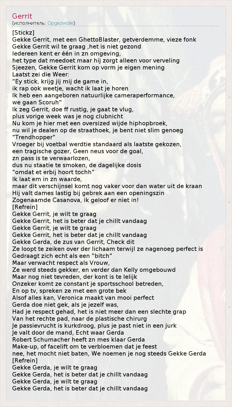[Stickz] Gekke Gerrit, met een GhettoBlaster, getverdemme, vieze fonk Gekke Gerrit wil te graag ,het is niet gezond Iedereen kent er één in zn omgeving, het type dat meedoet maar hij zorgt alleen voor verveling Sjeezen, Gekke Gerrit kom op vorm je eigen mening Laatst zei die Weer: "Ey stick, krijg jij mij de game in, ik rap ook weetje, wacht ik laat je horen Ik heb een aangeboren natuurlijke cameraperformance, we gaan Scoruh" Ik zeg Gerrit, doe ff rustig, je gaat te vlug, plus vorige week was je nog clubnicht Nu kom je hier met een oversized wijde hiphopbroek, nu wil je dealen op de straathoek, je bent niet slim genoeg "Trendhopper" Vroeger bij voetbal werdtie standaard als laatste gekozen, een tragische gozer, Geen neus voor de goal, zn pass is te verwaarlozen, dus nu staatie te smoken, de dagelijke dosis "omdat et erbij hoort tochh" Ik laat em in zn waarde, maar dit verschijnsel komt nog vaker voor dan water uit de kraan Hij valt dames lastig bij gebrek aan een openingszin Zogenaamde Casanova, ik geloof er niet in! [Refrein] Gekke Gerrit, je wilt te graag Gekke Gerrit, het is beter dat je chillt vandaag Gekke Gerrit, je wilt te graag Gekke Gerrit, het is beter dat je chillt vandaag Gekke Gerda, de zus van Gerrit, Check dit Ze loopt te zeiken over der lichaam terwijl ze nagenoeg perfect is Gedraagt zich echt als een "bitch" Maar verwacht respect als Vrouw, Ze werd steeds gekker, en verder dan Kelly omgebouwd Maar nog niet tevreden, der kont is te lelijk Onzeker komt ze constant je sportsschool betreden, En op tv, spreken ze met een grote bek Alsof alles kan, Veronica maakt van mooi perfect Gerda doe niet gek, als je jezelf was, Had je respect gehad, het is niet meer dan een slechte grap Van het rechte pad, naar de plastische chirurg Je passievrucht is kurkdroog, plus je past niet in een jurk Je valt door de mand, Echt waar Gerda Robert Schumacher heeft zn mes klaar Gerda Make-up, of facelift om te verbloemen dat je feest nee, het mocht niet baten, We noemen je nog steeds Gekke Gerda [Refrein] Gekke Gerda, je wilt te graag Gekke Gerda, het is beter dat je chillt vandaag Gekke Gerda, je wilt te graag Gekke Gerda, het is beter dat je chillt vandaag