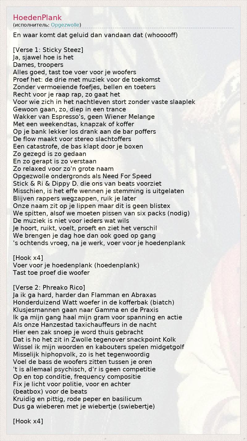 En waar komt dat geluid dan vandaan dat (whooooff) [Verse 1: Sticky Steez] Ja, sjawel hoe is het Dames, troopers Alles goed, tast toe voer voor je woofers Proef het: de drie met muziek voor de toekomst Zonder vermoeiende foefjes, bellen en toeters Recht voor je raap rap, zo gaat het Voor wie zich in het nachtleven stort zonder vaste slaaplek Gewoon gaan, zo, diep in een trance Wakker van Espresso's, geen Wiener Melange Met een weekendtas, knapzak of koffer Op je bank lekker los drank aan de bar poffers De flow maakt voor stereo slachtoffers Een catastrofe, de bas klapt door je boxen Zo gezegd is zo gedaan En zo gerapt is zo verstaan Zo relaxed voor zo'n grote naam Opgezwolle ondergronds als Need For Speed Stick & Ri & Dippy D. die ons van beats voorziet Misschien, is het effe wennen je stemming is uitgelaten Blijven rappers wegzappen, ruik je later Onze naam zit op je lippen maar dit is geen blistex We spitten, alsof we moeten pissen van six packs (nodig) De muziek is niet voor ieders wat wils Je hoort, ruikt, voelt, proeft en ziet het verschil We brengen je dag hoe dan ook goed op gang 's ochtends vroeg, na je werk, voer voor je hoedenplank [Hook x4] Voer voor je hoedenplank (hoedenplank) Tast toe proef die woofer [Verse 2: Phreako Rico] Ja ik ga hard, harder dan Flamman en Abraxas Honderduizend Watt woefer in de kofferbak (biatch) Klusjesmannen gaan naar Gamma en de Praxis Ik ga mijn gang haal mijn gram voor spanning en actie Als onze Hanzestad taxichauffeurs in de nacht Hier een zak snoep je word thuis gebracht Dat is ho het zit in Zwolle tegenover snackpoint Kolk Wissel ik mijn woorden en kabouters spelen midgetgolf Misselijk hiphopvolk, zo is het tegenwoordig Voel de bass de woofers zitten tussen je oren 't is allemaal psychisch, d'r is geen competitie Op en top conditie, frequency compositie Fix je licht voor politie, voor en achter (beatbox) voor de beats Kruidig en pittig, rode peper en basilicum Dus ga wieberen met je wiebertje (swiebertje) [Hook x4]