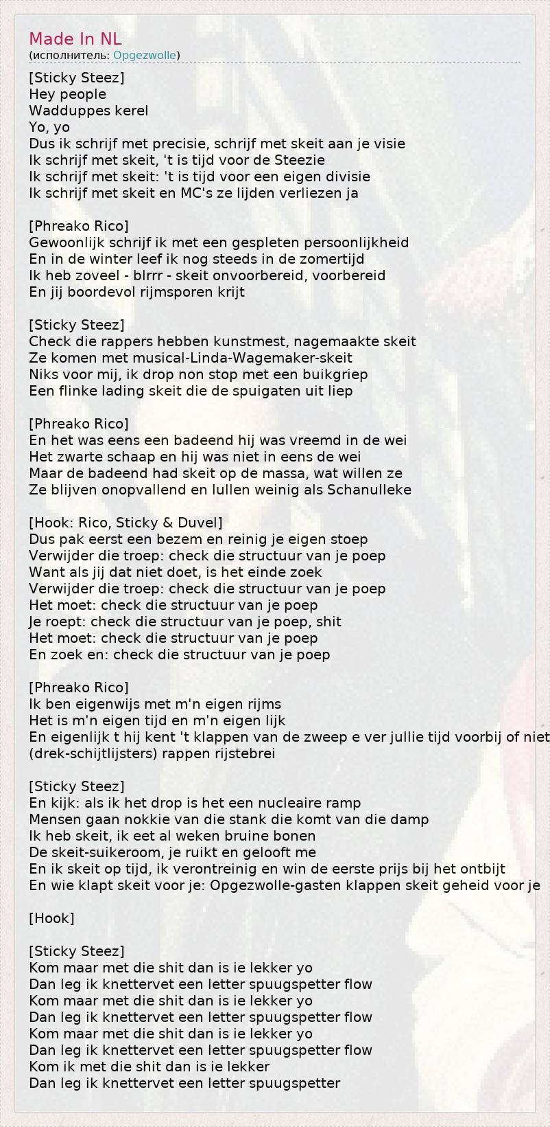[Sticky Steez] Hey people Wadduppes kerel Yo, yo Dus ik schrijf met precisie, schrijf met skeit aan je visie Ik schrijf met skeit, 't is tijd voor de Steezie Ik schrijf met skeit: 't is tijd voor een eigen divisie Ik schrijf met skeit en MC's ze lijden verliezen ja [Phreako Rico] Gewoonlijk schrijf ik met een gespleten persoonlijkheid En in de winter leef ik nog steeds in de zomertijd Ik heb zoveel - blrrr - skeit onvoorbereid, voorbereid En jij boordevol rijmsporen krijt [Sticky Steez] Check die rappers hebben kunstmest, nagemaakte skeit Ze komen met musical-Linda-Wagemaker-skeit Niks voor mij, ik drop non stop met een buikgriep Een flinke lading skeit die de spuigaten uit liep [Phreako Rico] En het was eens een badeend hij was vreemd in de wei Het zwarte schaap en hij was niet in eens de wei Maar de badeend had skeit op de massa, wat willen ze Ze blijven onopvallend en lullen weinig als Schanulleke [Hook: Rico, Sticky & Duvel] Dus pak eerst een bezem en reinig je eigen stoep Verwijder die troep: check die structuur van je poep Want als jij dat niet doet, is het einde zoek Verwijder die troep: check die structuur van je poep Het moet: check die structuur van je poep Je roept: check die structuur van je poep, shit Het moet: check die structuur van je poep En zoek en: check die structuur van je poep [Phreako Rico] Ik ben eigenwijs met m'n eigen rijms Het is m'n eigen tijd en m'n eigen lijk En eigenlijk t hij kent 't klappen van de zweep e ver jullie tijd voorbij of niet (drek-schijtlijsters) rappen rijstebrei [Sticky Steez] En kijk: als ik het drop is het een nucleaire ramp Mensen gaan nokkie van die stank die komt van die damp Ik heb skeit, ik eet al weken bruine bonen De skeit-suikeroom, je ruikt en gelooft me En ik skeit op tijd, ik verontreinig en win de eerste prijs bij het ontbijt En wie klapt skeit voor je: Opgezwolle-gasten klappen skeit geheid voor je [Hook] [Sticky Steez] Kom maar met die shit dan is ie lekker yo Dan leg ik knettervet een letter spuugspetter flow Kom maar met die shit dan is ie lekker yo Dan leg ik knettervet een letter spuugspetter flow Kom maar met die shit dan is ie lekker yo Dan leg ik knettervet een letter spuugspetter flow Kom ik met die shit dan is ie lekker Dan leg ik knettervet een letter spuugspetter