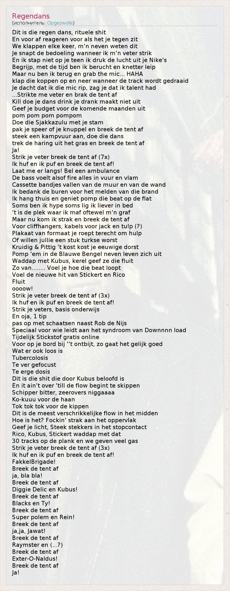 Dit is die regen dans, rituele shit En voor af reageren voor als het je tegen zit We klappen elke keer, m'n neven weten dit Je snapt de bedoeling wanneer ik m'n veter strik En ik stap niet op je teen ik druk de lucht uit je Nike's Begrijp, met de tijd ben ik berucht en knetter leip Maar nu ben ik terug en grab the mic... HAHA klap die koppen op en neer wanneer de track wordt gedraaid Je dacht dat ik die mic rip, zag je dat ik talent had ...Strikte me veter en brak de tent af Kill doe je dans drink je drank maakt niet uit Geef je budget voor de komende maanden uit pom pom pom pompom Doe die Sjakkazulu met je stam pak je speer of je knuppel en breek de tent af steek een kampvuur aan, doe die dans trek de haring uit het gras en breek de tent af Ja! Strik je veter breek de tent af (7x) Ik huf en ik puf en breek de tent af! Laat me er langs! Bel een ambulance De bass voelt alsof fire alles in vuur en vlam Cassette bandjes vallen van de muur en van de wand Ik bedank de buren voor het melden van die brand Ik hang thuis en geniet pomp die beat op de flat Soms ben ik hype soms lig ik liever in bed 't is de plek waar ik maf oftewel m'n graf Maar nu kom ik strak en breek de tent af Voor cliffhangers, kabels voor jack en tulp (?) Plakaat van formaat je roept terecht om hulp Of willen jullie een stuk turkse worst Kruidig & Pittig 't kost kost je eeuwige dorst Pomp 'em in de Blauwe Bengel neven leven zich uit Waddap met Kubus, kerel geef ze die fluit Zo van........ Voel je hoe die beat loopt Voel de nieuwe hit van Stickert en Rico Fluit oooow! Strik je veter breek de tent af (3x) Ik huf en ik puf en breek de tent af! Strik je veters, basis onderwijs En oja, 1 tip pas op met schaatsen naast Rob de Nijs Speciaal voor wie leidt aan het syndroom van Downnnn load Tijdelijk Stickstof gratis online Voor op je bord bij ''t ontbijt, zo gaat het gelijk goed Wat er ook loos is Tubercolosis Te ver gefocust Te erge dosis Dit is die shit die door Kubus beloofd is En it ain't over 'till de flow begint te skippen Schipper bitter, zeerovers niggaaaa Ko-kuuu voor de haan Tok tok tok voor de kippen Dit is de meest verschrikkelijke flow in het midden Hoe is het? Fockin' strak aan het oppervlak Geef je licht, Steek stekkers in het stopcontact Rico, Kubus, Stickert waddap met dat 30 tracks op de plank en we geven veel gas Strik je veter breek de tent af (3x) Ik huf en ik puf en breek de tent af! FakkelBrigade! Breek de tent af ja, bla bla! Breek de tent af Diggie Delic en Kubus! Breek de tent af Blacks en Ty! Breek de tent af Super polem en Rein! Breek de tent af ja,ja, Jawat! Breek de tent af Raymster en (...?) Breek de tent af Exter-O-Naldus! Breek de tent af Ja!