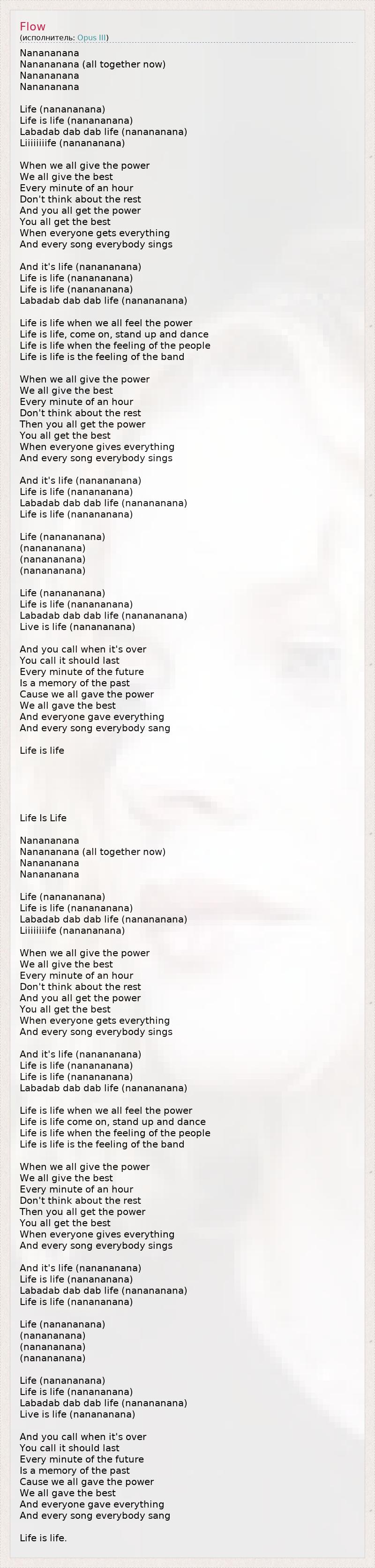 Nanananana Nanananana (all together now) Nanananana Nanananana Life (nanananana) Life is life (nanananana) Labadab dab dab life (nanananana) Liiiiiiiife (nanananana) When we all give the power We all give the best Every minute of an hour Don't think about the rest And you all get the power You all get the best When everyone gets everything And every song everybody sings And it's life (nanananana) Life is life (nanananana) Life is life (nanananana) Labadab dab dab life (nanananana) Life is life when we all feel the power Life is life, come on, stand up and dance Life is life when the feeling of the people Life is life is the feeling of the band When we all give the power We all give the best Every minute of an hour Don't think about the rest Then you all get the power You all get the best When everyone gives everything And every song everybody sings And it's life (nanananana) Life is life (nanananana) Labadab dab dab life (nanananana) Life is life (nanananana) Life (nanananana) (nanananana) (nanananana) (nanananana) Life (nanananana) Life is life (nanananana) Labadab dab dab life (nanananana) Live is life (nanananana) And you call when it's over You call it should last Every minute of the future Is a memory of the past Cause we all gave the power We all gave the best And everyone gave everything And every song everybody sang Life is life Life Is Life Nanananana Nanananana (all together now) Nanananana Nanananana Life (nanananana) Life is life (nanananana) Labadab dab dab life (nanananana) Liiiiiiiife (nanananana) When we all give the power We all give the best Every minute of an hour Don't think about the rest And you all get the power You all get the best When everyone gets everything And every song everybody sings And it's life (nanananana) Life is life (nanananana) Life is life (nanananana) Labadab dab dab life (nanananana) Life is life when we all feel the power Life is life come on, stand up and dance Life is life when the feeling of the people Life is life is the feeling of the band When we all give the power We all give the best Every minute of an hour Don't think about the rest Then you all get the power You all get the best When everyone gives everything And every song everybody sings And it's life (nanananana) Life is life (nanananana) Labadab dab dab life (nanananana) Life is life (nanananana) Life (nanananana) (nanananana) (nanananana) (nanananana) Life (nanananana) Life is life (nanananana) Labadab dab dab life (nanananana) Live is life (nanananana) And you call when it's over You call it should last Every minute of the future Is a memory of the past Cause we all gave the power We all gave the best And everyone gave everything And every song everybody sang Life is life.