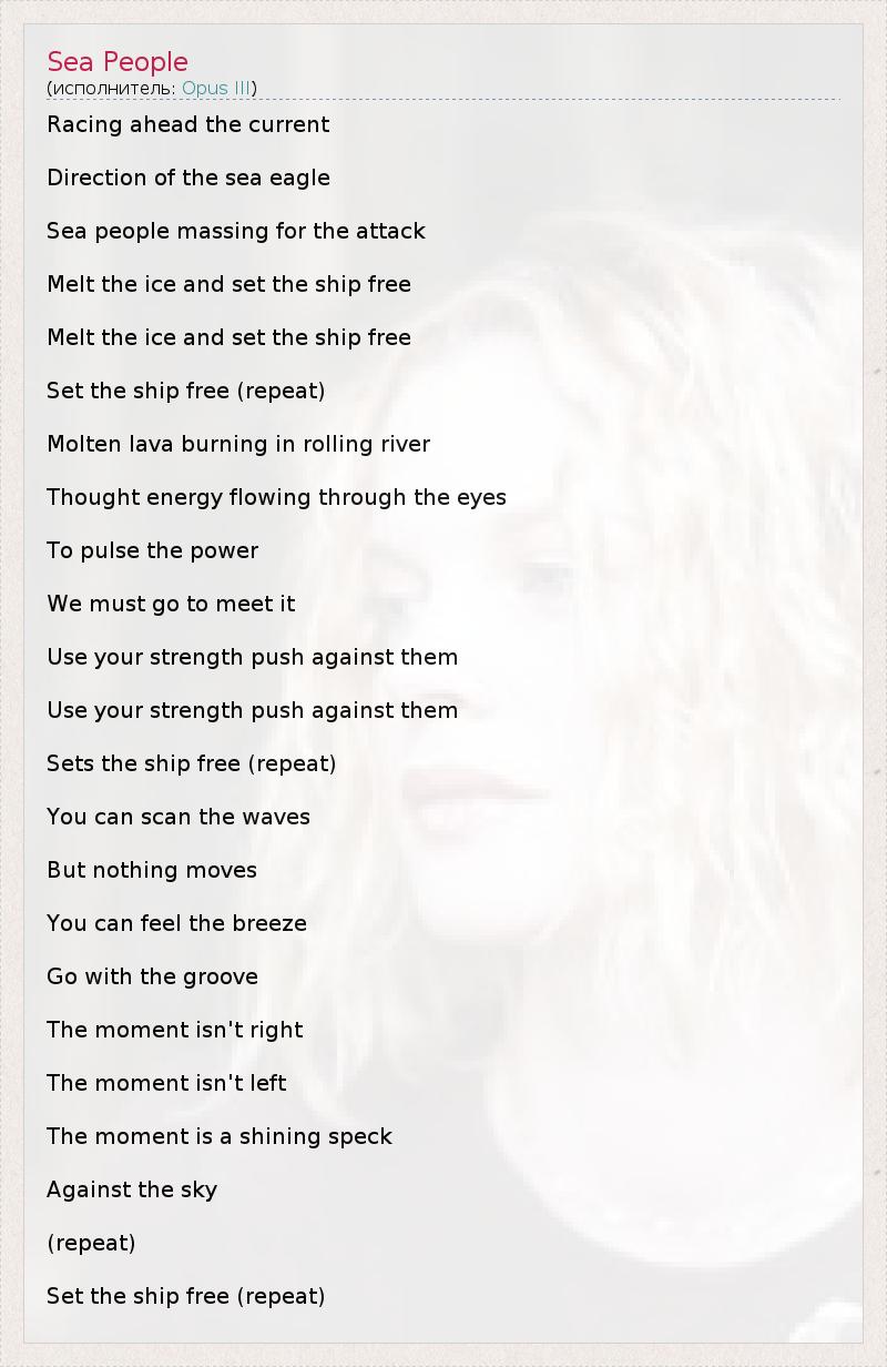 Racing ahead the current Direction of the sea eagle Sea people massing for the attack Melt the ice and set the ship free Melt the ice and set the ship free Set the ship free (repeat) Molten lava burning in rolling river Thought energy flowing through the eyes To pulse the power We must go to meet it Use your strength push against them Use your strength push against them Sets the ship free (repeat) You can scan the waves But nothing moves You can feel the breeze Go with the groove The moment isn't right The moment isn't left The moment is a shining speck Against the sky (repeat) Set the ship free (repeat)