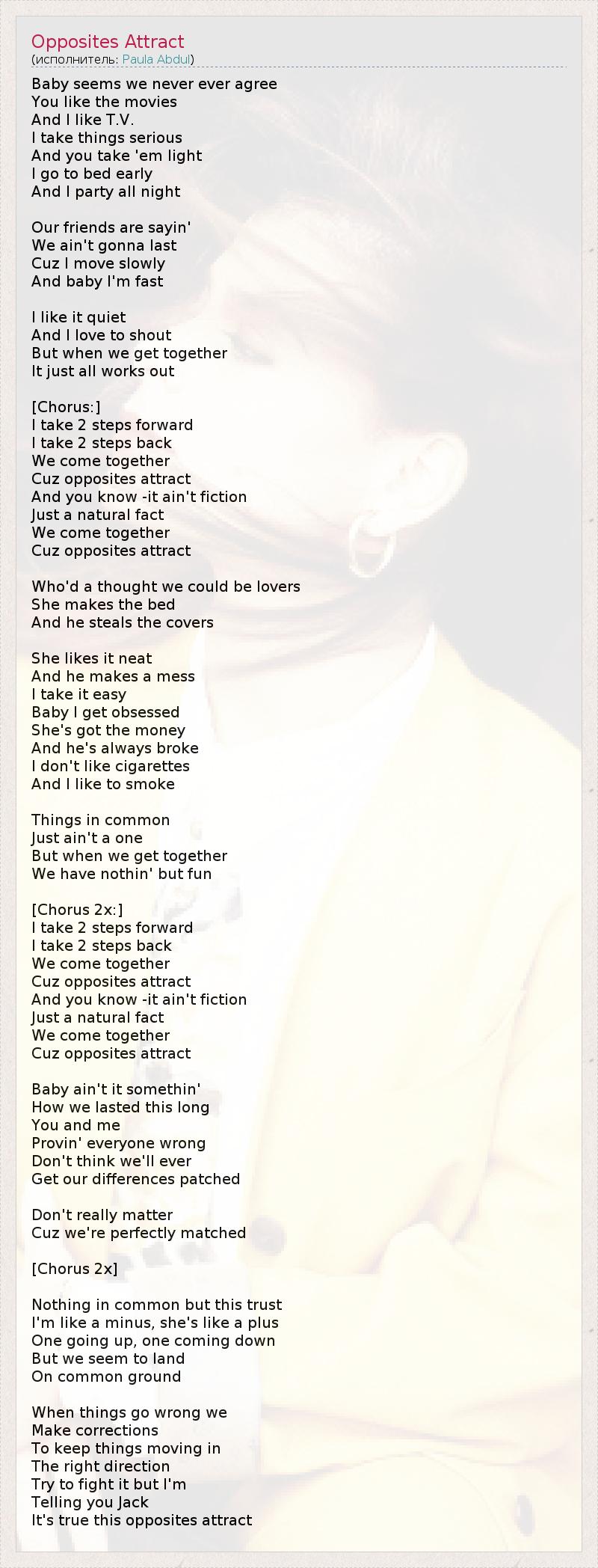 Baby seems we never ever agree You like the movies And I like T.V. I take things serious And you take 'em light I go to bed early And I party all night Our friends are sayin' We ain't gonna last Cuz I move slowly And baby I'm fast I like it quiet And I love to shout But when we get together It just all works out [Chorus:] I take 2 steps forward I take 2 steps back We come together Cuz opposites attract And you know -it ain't fiction Just a natural fact We come together Cuz opposites attract Who'd a thought we could be lovers She makes the bed And he steals the covers She likes it neat And he makes a mess I take it easy Baby I get obsessed She's got the money And he's always broke I don't like cigarettes And I like to smoke Things in common Just ain't a one But when we get together We have nothin' but fun [Chorus 2x:] I take 2 steps forward I take 2 steps back We come together Cuz opposites attract And you know -it ain't fiction Just a natural fact We come together Cuz opposites attract Baby ain't it somethin' How we lasted this long You and me Provin' everyone wrong Don't think we'll ever Get our differences patched Don't really matter Cuz we're perfectly matched [Chorus 2x] Nothing in common but this trust I'm like a minus, she's like a plus One going up, one coming down But we seem to land On common ground When things go wrong we Make corrections To keep things moving in The right direction Try to fight it but I'm Telling you Jack It's true this opposites attract
