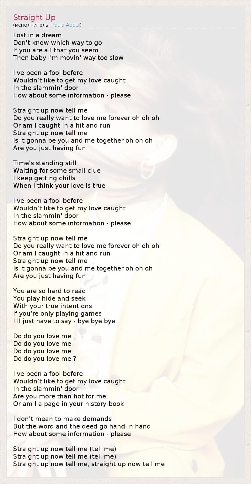 Lost in a dream Don't know which way to go If you are all that you seem Then baby I'm movin' way too slow I've been a fool before Wouldn't like to get my love caught In the slammin' door How about some information - please Straight up now tell me Do you really want to love me forever oh oh oh Or am I caught in a hit and run Straight up now tell me Is it gonna be you and me together oh oh oh Are you just having fun Time's standing still Waiting for some small clue I keep getting chills When I think your love is true I've been a fool before Wouldn't like to get my love caught In the slammin' door How about some information - please Straight up now tell me Do you really want to love me forever oh oh oh Or am I caught in a hit and run Straight up now tell me Is it gonna be you and me together oh oh oh Are you just having fun You are so hard to read You play hide and seek With your true intentions If you're only playing games I'll just have to say - bye bye bye... Do do you love me Do do you love me Do do you love me Do do you love me ? I've been a fool before Wouldn't like to get my love caught In the slammin' door Are you more than hot for me Or am I a page in your history-book I don't mean to make demands But the word and the deed go hand in hand How about some information - please Straight up now tell me (tell me) Straight up now tell me (tell me) Straight up now tell me, straight up now tell me