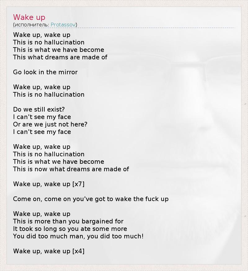Проснись!Проснись! Это не галлюцинация. Это то, чем мы стали, Это то из чеГо состоят сны. Иди, взгляни в зеркало. Проснись!Проснись! Это не галлюцинация. Мы до сих пор живем, Или мы уже здесь сгнили? Я не вижу своего лица. Проснись!Проснись! Это не галлюцинация. Это то, чем мы стали, Это то из чего состоят сны. Проснись!(х8) Давай!Давай! Блядь!Ты должен проснуться! Проснись!Проснись! Это больше чем ты хотел. Это слишком долго и ты сгнил немного больше. Ты принял слишком много, чувак. Ты принял слишком много. Проснись!Проснись!