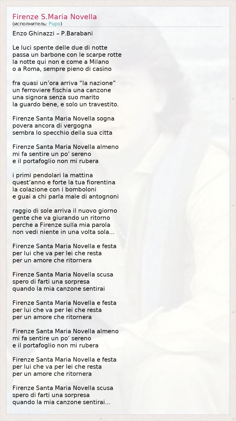Enzo Ghinazzi – P.Barabani Le luci spente delle due di notte passa un barbone con le scarpe rotte la notte qui non e come a Milano o a Roma, sempre pieno di casino fra quasi un’ora arriva “la nazione” un ferroviere fischia una canzone una signora senza suo marito la guardo bene, e solo un travestito. Firenze Santa Maria Novella sogna povera ancora di vergogna sembra lo specchio della sua citta Firenze Santa Maria Novella almeno mi fa sentire un po’ sereno e il portafoglio non mi rubera i primi pendolari la mattina quest’anno e forte la tua fiorentina la colazione con i bomboloni e guai a chi parla male di antognoni raggio di sole arriva il nuovo giorno gente che va giurando un ritorno perche a Firenze sulla mia parola non vedi niente in una volta sola... Firenze Santa Maria Novella e festa per lui che va per lei che resta per un amore che ritornera Firenze Santa Maria Novella scusa spero di farti una sorpresa quando la mia canzone sentirai Firenze Santa Maria Novella e festa per lui che va per lei che resta per un amore che ritornera Firenze Santa Maria Novella almeno mi fa sentire un po’ sereno e il portafoglio non mi rubera Firenze Santa Maria Novella e festa per lui che va per lei che resta per un amore che ritornera Firenze Santa Maria Novella scusa spero di farti una sorpresa quando la mia canzone sentirai...