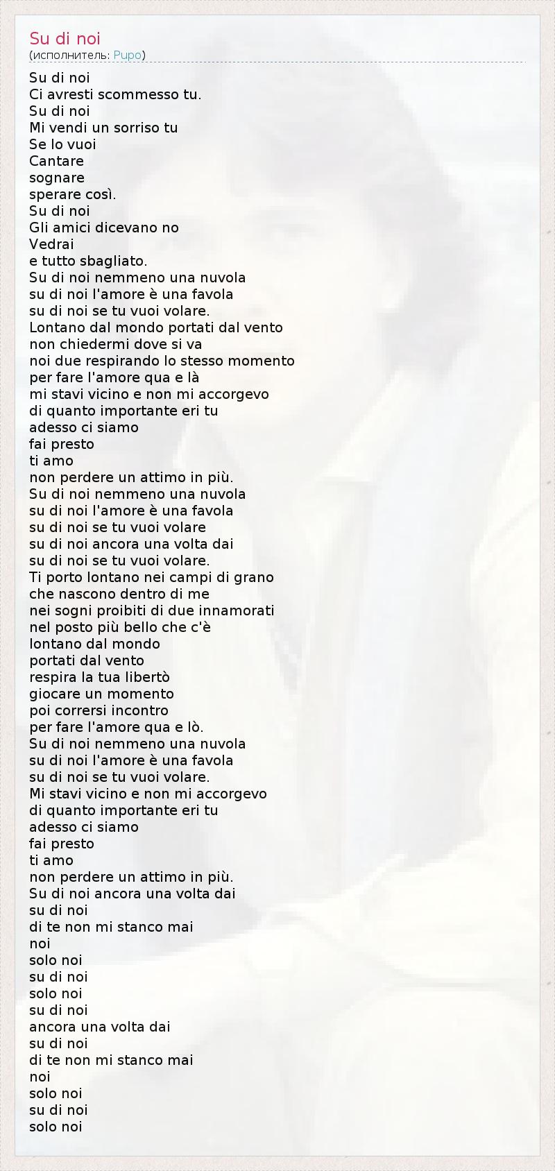 Su di noi Ci avresti scommesso tu. Su di noi Mi vendi un sorriso tu Se lo vuoi Cantare sognare sperare così. Su di noi Gli amici dicevano no Vedrai e tutto sbagliato. Su di noi nemmeno una nuvola su di noi l'amore è una favola su di noi se tu vuoi volare. Lontano dal mondo portati dal vento non chiedermi dove si va noi due respirando lo stesso momento per fare l'amore qua e là mi stavi vicino e non mi accorgevo di quanto importante eri tu adesso ci siamo fai presto ti amo non perdere un attimo in più. Su di noi nemmeno una nuvola su di noi l'amore è una favola su di noi se tu vuoi volare su di noi ancora una volta dai su di noi se tu vuoi volare. Ti porto lontano nei campi di grano che nascono dentro di me nei sogni proibiti di due innamorati nel posto più bello che c'è lontano dal mondo portati dal vento respira la tua libertò giocare un momento poi corrersi incontro per fare l'amore qua e lò. Su di noi nemmeno una nuvola su di noi l'amore è una favola su di noi se tu vuoi volare. Mi stavi vicino e non mi accorgevo di quanto importante eri tu adesso ci siamo fai presto ti amo non perdere un attimo in più. Su di noi ancora una volta dai su di noi di te non mi stanco mai noi solo noi su di noi solo noi su di noi ancora una volta dai su di noi di te non mi stanco mai noi solo noi su di noi solo noi