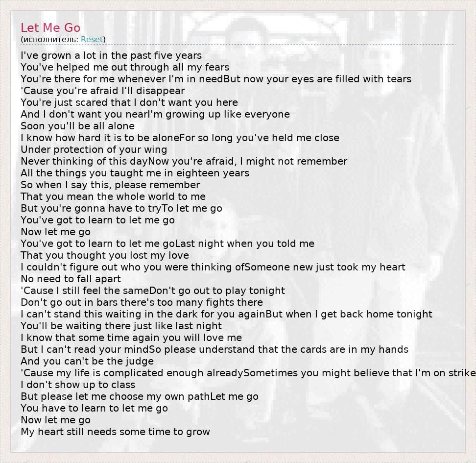I've grown a lot in the past five years You've helped me out through all my fears You're there for me whenever I'm in needBut now your eyes are filled with tears 'Cause you're afraid I'll disappear You're just scared that I don't want you here And I don't want you nearI'm growing up like everyone Soon you'll be all alone I know how hard it is to be aloneFor so long you've held me close Under protection of your wing Never thinking of this dayNow you're afraid, I might not remember All the things you taught me in eighteen years So when I say this, please remember That you mean the whole world to me But you're gonna have to tryTo let me go You've got to learn to let me go Now let me go You've got to learn to let me goLast night when you told me That you thought you lost my love I couldn't figure out who you were thinking ofSomeone new just took my heart No need to fall apart 'Cause I still feel the sameDon't go out to play tonight Don't go out in bars there's too many fights there I can't stand this waiting in the dark for you againBut when I get back home tonight You'll be waiting there just like last night I know that some time again you will love me But I can't read your mindSo please understand that the cards are in my hands And you can't be the judge 'Cause my life is complicated enough alreadySometimes you might believe that I'm on strike I don't show up to class But please let me choose my own pathLet me go You have to learn to let me go Now let me go My heart still needs some time to grow