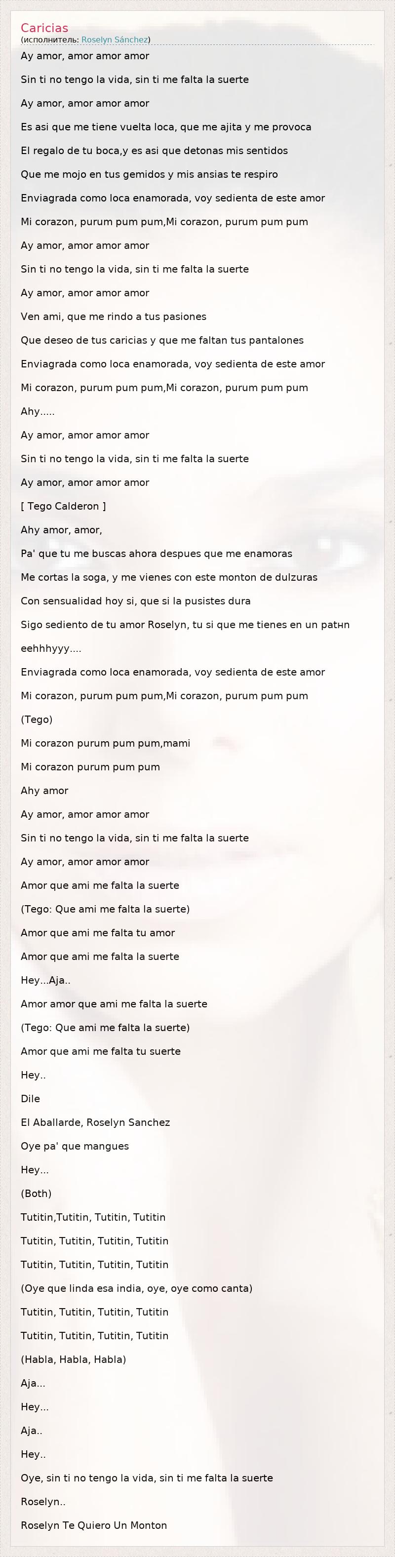 Ay amor, amor amor amor Sin ti no tengo la vida, sin ti me falta la suerte Ay amor, amor amor amor Es asi que me tiene vuelta loca, que me ajita y me provoca El regalo de tu boca,y es asi que detonas mis sentidos Que me mojo en tus gemidos y mis ansias te respiro Enviagrada como loca enamorada, voy sedienta de este amor Mi corazon, purum pum pum,Mi corazon, purum pum pum Ay amor, amor amor amor Sin ti no tengo la vida, sin ti me falta la suerte Ay amor, amor amor amor Ven ami, que me rindo a tus pasiones Que deseo de tus caricias y que me faltan tus pantalones Enviagrada como loca enamorada, voy sedienta de este amor Mi corazon, purum pum pum,Mi corazon, purum pum pum Ahy..... Ay amor, amor amor amor Sin ti no tengo la vida, sin ti me falta la suerte Ay amor, amor amor amor [ Tego Calderon ] Ahy amor, amor, Pa' que tu me buscas ahora despues que me enamoras Me cortas la soga, y me vienes con este monton de dulzuras Con sensualidad hoy si, que si la pusistes dura Sigo sediento de tu amor Roselyn, tu si que me tienes en un patнn eehhhyyy.... Enviagrada como loca enamorada, voy sedienta de este amor Mi corazon, purum pum pum,Mi corazon, purum pum pum (Tego) Mi corazon purum pum pum,mami Mi corazon purum pum pum Ahy amor Ay amor, amor amor amor Sin ti no tengo la vida, sin ti me falta la suerte Ay amor, amor amor amor Amor que ami me falta la suerte (Tego: Que ami me falta la suerte) Amor que ami me falta tu amor Amor que ami me falta la suerte Hey...Aja.. Amor amor que ami me falta la suerte (Tego: Que ami me falta la suerte) Amor que ami me falta tu suerte Hey.. Dile El Aballarde, Roselyn Sanchez Oye pa' que mangues Hey... (Both) Tutitin,Tutitin, Tutitin, Tutitin Tutitin, Tutitin, Tutitin, Tutitin Tutitin, Tutitin, Tutitin, Tutitin (Oye que linda esa india, oye, oye como canta) Tutitin, Tutitin, Tutitin, Tutitin Tutitin, Tutitin, Tutitin, Tutitin (Habla, Habla, Habla) Aja... Hey... Aja.. Hey.. Oye, sin ti no tengo la vida, sin ti me falta la suerte Roselyn.. Roselyn Te Quiero Un Monton