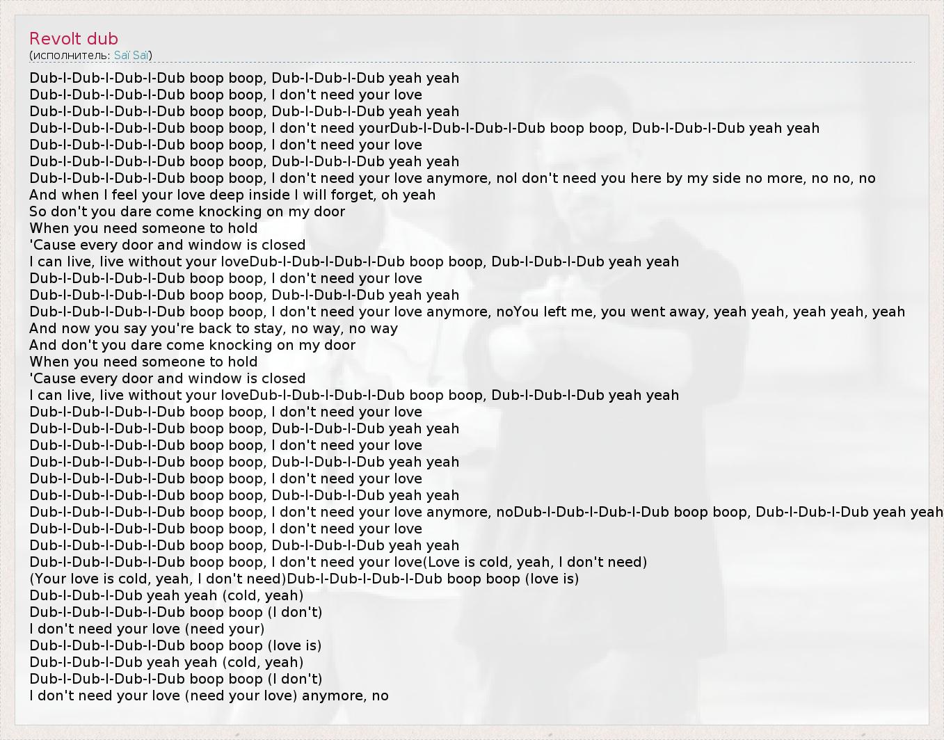 Dub-I-Dub-I-Dub-I-Dub boop boop, Dub-I-Dub-I-Dub yeah yeah Dub-I-Dub-I-Dub-I-Dub boop boop, I don't need your love Dub-I-Dub-I-Dub-I-Dub boop boop, Dub-I-Dub-I-Dub yeah yeah Dub-I-Dub-I-Dub-I-Dub boop boop, I don't need yourDub-I-Dub-I-Dub-I-Dub boop boop, Dub-I-Dub-I-Dub yeah yeah Dub-I-Dub-I-Dub-I-Dub boop boop, I don't need your love Dub-I-Dub-I-Dub-I-Dub boop boop, Dub-I-Dub-I-Dub yeah yeah Dub-I-Dub-I-Dub-I-Dub boop boop, I don't need your love anymore, noI don't need you here by my side no more, no no, no And when I feel your love deep inside I will forget, oh yeah So don't you dare come knocking on my door When you need someone to hold 'Cause every door and window is closed I can live, live without your loveDub-I-Dub-I-Dub-I-Dub boop boop, Dub-I-Dub-I-Dub yeah yeah Dub-I-Dub-I-Dub-I-Dub boop boop, I don't need your love Dub-I-Dub-I-Dub-I-Dub boop boop, Dub-I-Dub-I-Dub yeah yeah Dub-I-Dub-I-Dub-I-Dub boop boop, I don't need your love anymore, noYou left me, you went away, yeah yeah, yeah yeah, yeah And now you say you're back to stay, no way, no way And don't you dare come knocking on my door When you need someone to hold 'Cause every door and window is closed I can live, live without your loveDub-I-Dub-I-Dub-I-Dub boop boop, Dub-I-Dub-I-Dub yeah yeah Dub-I-Dub-I-Dub-I-Dub boop boop, I don't need your love Dub-I-Dub-I-Dub-I-Dub boop boop, Dub-I-Dub-I-Dub yeah yeah Dub-I-Dub-I-Dub-I-Dub boop boop, I don't need your love Dub-I-Dub-I-Dub-I-Dub boop boop, Dub-I-Dub-I-Dub yeah yeah Dub-I-Dub-I-Dub-I-Dub boop boop, I don't need your love Dub-I-Dub-I-Dub-I-Dub boop boop, Dub-I-Dub-I-Dub yeah yeah Dub-I-Dub-I-Dub-I-Dub boop boop, I don't need your love anymore, noDub-I-Dub-I-Dub-I-Dub boop boop, Dub-I-Dub-I-Dub yeah yeah Dub-I-Dub-I-Dub-I-Dub boop boop, I don't need your love Dub-I-Dub-I-Dub-I-Dub boop boop, Dub-I-Dub-I-Dub yeah yeah Dub-I-Dub-I-Dub-I-Dub boop boop, I don't need your love(Love is cold, yeah, I don't need) (Your love is cold, yeah, I don't need)Dub-I-Dub-I-Dub-I-Dub boop boop (love is) Dub-I-Dub-I-Dub yeah yeah (cold, yeah) Dub-I-Dub-I-Dub-I-Dub boop boop (I don't) I don't need your love (need your) Dub-I-Dub-I-Dub-I-Dub boop boop (love is) Dub-I-Dub-I-Dub yeah yeah (cold, yeah) Dub-I-Dub-I-Dub-I-Dub boop boop (I don't) I don't need your love (need your love) anymore, no