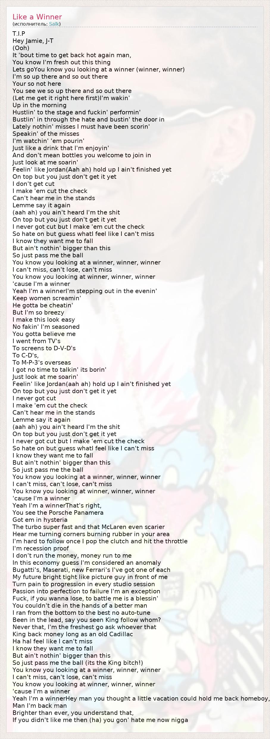 T.I.P Hey Jamie, J-T (Ooh) It 'bout time to get back hot again man, You know I'm fresh out this thing Lets goYou know you looking at a winner (winner, winner) I'm so up there and so out there Your so not here You see we so up there and so out there (Let me get it right here first)I'm wakin' Up in the morning Hustlin' to the stage and fuckin' performin' Bustlin' in through the hate and bustin' the door in Lately nothin' misses I must have been scorin' Speakin' of the misses I'm watchin' 'em pourin' Just like a drink that I'm enjoyin' And don't mean bottles you welcome to join in Just look at me soarin' Feelin' like Jordan(Aah ah) hold up I ain't finished yet On top but you just don't get it yet I don't get cut I make 'em cut the check Can't hear me in the stands Lemme say it again (aah ah) you ain't heard I'm the shit On top but you just don't get it yet I never got cut but I make 'em cut the check So hate on but guess whatI feel like I can't miss I know they want me to fall But ain't nothin' bigger than this So just pass me the ball You know you looking at a winner, winner, winner I can't miss, can't lose, can't miss You know you looking at winner, winner, winner 'cause I'm a winner Yeah I'm a winnerI'm stepping out in the evenin' Keep women screamin' He gotta be cheatin' But I'm so breezy I make this look easy No fakin' I'm seasoned You gotta believe me I went from TV's To screens to D-V-D's To C-D's, To M-P-3's overseas I got no time to talkin' its borin' Just look at me soarin' Feelin' like Jordan(aah ah) hold up I ain't finished yet On top but you just don't get it yet I never got cut I make 'em cut the check Can't hear me in the stands Lemme say it again (aah ah) you ain't heard I'm the shit On top but you just don't get it yet I never got cut but I make 'em cut the check So hate on but guess whatI feel like I can't miss I know they want me to fall But ain't nothin' bigger than this So just pass me the ball You know you looking at a winner, winner, winner I can't miss, can't lose, can't miss You know you looking at winner, winner, winner 'cause I'm a winner Yeah I'm a winnerThat's right, You see the Porsche Panamera Got em in hysteria The turbo super fast and that McLaren even scarier Hear me turning corners burning rubber in your area I'm hard to follow once I pop the clutch and hit the throttle I'm recession proof I don't run the money, money run to me In this economy guess I'm considered an anomaly Bugatti's, Maserati, new Ferrari's I've got one of each My future bright tight like picture guy in front of me Turn pain to progression in every studio session Passion into perfection to failure I'm an exception Fuck, if you wanna lose, to battle me is a blessin' You couldn't die in the hands of a better man I ran from the bottom to the best no auto-tune Been in the lead, say you seen King follow whom? Never that, I'm the freshest go ask whoever that King back money long as an old Cadillac Ha haI feel like I can't miss I know they want me to fall But ain't nothin' bigger than this So just pass me the ball (its the King bitch!) You know you looking at a winner, winner, winner I can't miss, can't lose, can't miss You know you looking at winner, winner, winner 'cause I'm a winner Yeah I'm a winnerHey man you thought a little vacation could hold me back homeboy, Man I'm back man Brighter than ever, you understand that, If you didn't like me then (ha) you gon' hate me now nigga