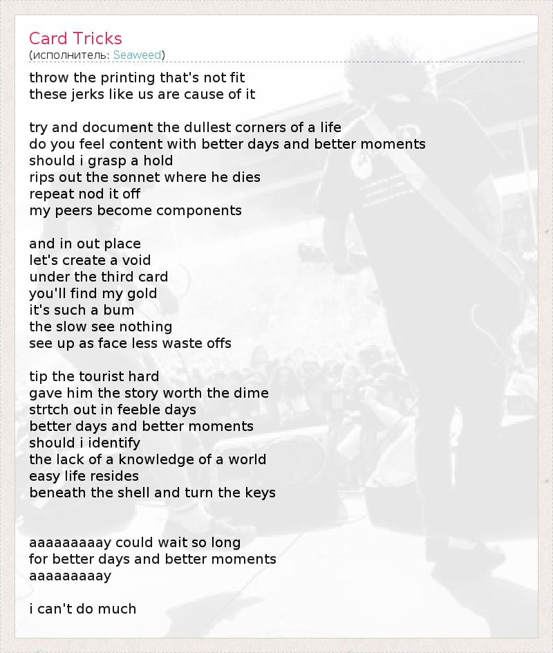 throw the printing that's not fit these jerks like us are cause of it try and document the dullest corners of a life do you feel content with better days and better moments should i grasp a hold rips out the sonnet where he dies repeat nod it off my peers become components and in out place let's create a void under the third card you'll find my gold it's such a bum the slow see nothing see up as face less waste offs tip the tourist hard gave him the story worth the dime strtch out in feeble days better days and better moments should i identify the lack of a knowledge of a world easy life resides beneath the shell and turn the keys aaaaaaaaay could wait so long for better days and better moments aaaaaaaaay i can't do much