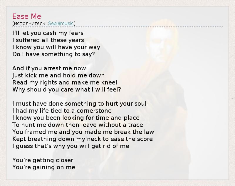 I’ll let you cash my fears I suffered all these years I know you will have your way Do I have something to say? And if you arrest me now Just kick me and hold me down Read my rights and make me kneel Why should you care what I will feel? I must have done something to hurt your soul I had my life tied to a cornerstone I know you been looking for time and place To hunt me down then leave without a trace You framed me and you made me break the law Kept breathing down my neck to ease the score I guess that’s why you will get rid of me You’re getting closer You’re gaining on me