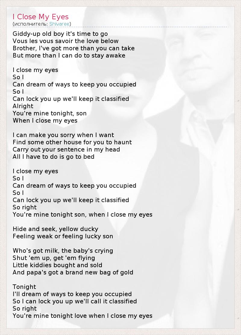 Giddy-up old boy it's time to go Vous les vous savoir the love below Brother, I've got more than you can take But more than I can do to stay awake I close my eyes So I Can dream of ways to keep you occupied So I Can lock you up we'll keep it classified Alright You're mine tonight, son When I close my eyes I can make you sorry when I want Find some other house for you to haunt Carry out your sentence in my head All I have to do is go to bed I close my eyes So I Can dream of ways to keep you occupied So I Can lock you up we'll keep it classified So right You're mine tonight son, when I close my eyes Hide and seek, yellow ducky Feeling weak or feeling lucky son Who's got milk, the baby's crying Shut 'em up, get 'em flying Little kiddies bought and sold And papa's got a brand new bag of gold Tonight I'll dream of ways to keep you occupied So I can lock you up we'll call it classified So right You're mine tonight love when I close my eyes