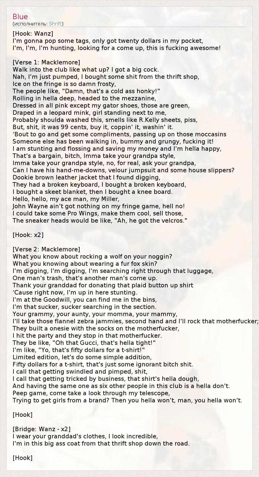 [Хук: Wanz] Я тут собираюсь маленько приодеться, но в кармане только двадцать долларов, И я, я, я, будто старатель, выискивающий золото, это просто о**ительно! [Куплет 1: Macklemore] Захожу в клуб, чего тут новенького? У меня большой х**н. Да не, это я шутканул, я просто прибарахлился в комиссионке, Камушки по краям, это вообщё ништяк, Народ такой: "Блин, реально чёткий белый пацан!" Я пробираюсь сквозь толпу, иду в бельэтаж, Одетый во всё розовое, кроме ботинок из крокодила – они зелёные, Рядом со мной стоит девчонка, на мне шуба леопардового меха, Наверное, надо было постирать её, а то от неё несёт сс**ами, как от простыней Ар Келли, 1 Да, на х**, зато всего 99 центов: выбрал, оплатил, состирнул. Ещё скажите спасибо, что не купил мокасины: В них до меня уже кто-то ходил, поэтому они загаженные и вонючие, ну их на х**! Я модный и стильный, ещё и денег сэкономил, так что радости полные штаны, Это удачное вложение денег, с**а; я позаимствую стиль у твоего дедули, Я позаимствую стиль у твоего дедули, не, серьёзно, там порасспрашивай его: Отдаст он мне свои старые тряпки, велюровый комбез и какие-нибудь тапки? Ещё я откопал какашечно-коричневый кожаный куртец, Там у них был сломанный синтезатор, ну, я и его купил, Взял простынку для д**чки, потом ещё ниборд. 2 Мои приветы крутому парняге Миллеру, Бахрома Джона Уэйна с моей даже рядом не свисала! 3 Я могу купить дешёвые шузы, раскрутить их и продать подороже, И все фаны кроссовок обалдеют: "Ух ты, они у него на липучках!" [Хук: x2] [Куплет 2: Macklemore] Что ты можешь понимать в ношении шкуры волка на голове? Что ты знаешь об облачении в лисий мех? Я ищу, я роюсь, я ворошу все эти кипы, Что для одного мусор, для другого – сокровище. Спасибо твоему дедушке за клетчатую рубашку на пуговках, Я теперь буду рассекать в ней. Сейчас я в "Гудвилле", 4 роюсь в кучах тряпья, Можешь звать меня лохом, но лохом, который прошуршал весь отдел. У твоих бабуси, тетушки, мамочки и няньки Я возьму фланелевые пижамы с узором зебры, пускай это секонд-хэнд, зато обос**ться, как модно, К тому же, они образуют комплект с носками, Я жгу на вечеринке в этом о**енительном наряде и, вдруг все останавливаются, И такие: "Ух ты, Гуччи, вообще шикарно!" А я: "Да вы чё? Пятьдесят баксов за футболку!" Типа ограниченная серия; давайте проведём несложные вычисления: Платить пятьдесят долларов за футболку – это пи**ец, как тупо. Это грабёж и надувательство, Вас просто обведут вокруг пальца, за такую-то цену, Да в придачу ещё шесть чуваков в клубе точно в таких же, это ни фига не круто. Давай играть в гляделки, посмотри в мой телескоп, Пытаешься склеить девок модными брендами? Ни фига не выйдет, чел, ни фига не выйдет. [Хук] [Переход: Wanz - x2] Я одет, как твой дед и выгляжу потрясно, Я в здоровенном пиджаке из комиссионки, что вниз по улице. [Хук] * – Thrift shop – розничный магазин, управляемый благотворительной организацией или группой активистов с целью привлечения средств на конкретную цель, однако, жителям СНГ более близко понятие "комиссионного магазина", поэтому я считаю возможной замену транслатемы. 1 – В феврале 2002 года было опубликовано порнографическое видео с урофилическим уклоном с участием r'n'b-певца R.Kelly и несовершеннолетней девушки. 2 – Особая, короткая и широкая, доска для сёрфинга; на ней катаются, стоя на коленях. 3 – Джон Уэйн – американский киноактёр, звезда вестернов. Непременным атрибутом ковбоя с