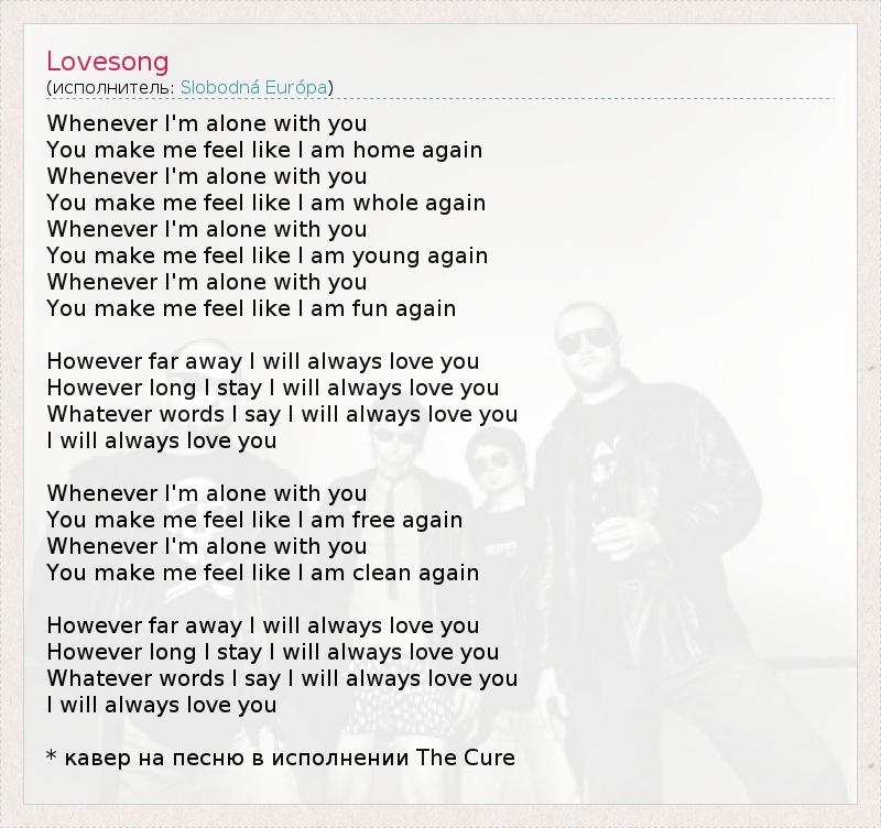 Whenever I'm alone with you You make me feel like I am home again Whenever I'm alone with you You make me feel like I am whole again Whenever I'm alone with you You make me feel like I am young again Whenever I'm alone with you You make me feel like I am fun again However far away I will always love you However long I stay I will always love you Whatever words I say I will always love you I will always love you Whenever I'm alone with you You make me feel like I am free again Whenever I'm alone with you You make me feel like I am clean again However far away I will always love you However long I stay I will always love you Whatever words I say I will always love you I will always love you * кавер на песню в исполнении The Cure