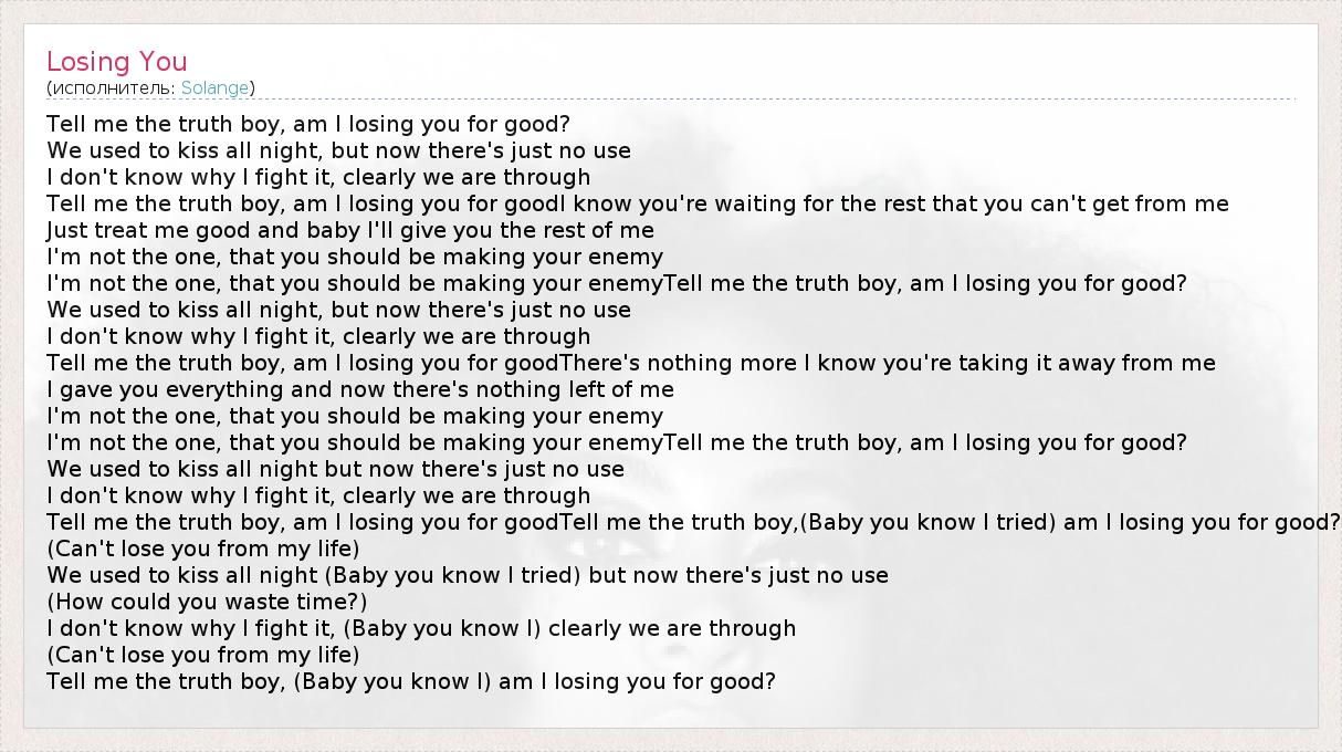 Tell me the truth boy, am I losing you for goodTell me the truth boy,(Baby you know I tried) am I losing you for good?