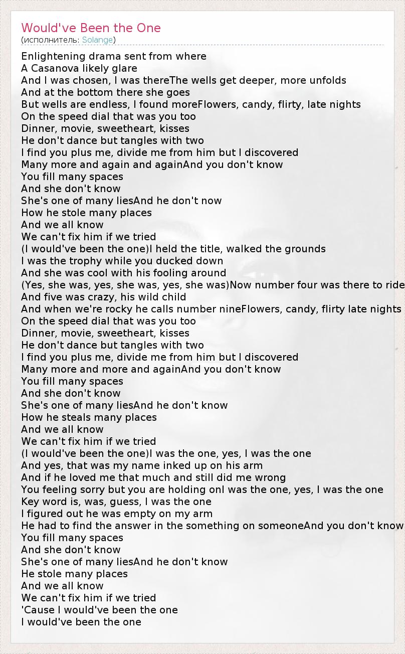 Enlightening drama sent from where A Casanova likely glare And I was chosen, I was thereThe wells get deeper, more unfolds And at the bottom there she goes But wells are endless, I found moreFlowers, candy, flirty, late nights On the speed dial that was you too Dinner, movie, sweetheart, kisses He don't dance but tangles with two I find you plus me, divide me from him but I discovered Many more and again and againAnd you don't know You fill many spaces And she don't know She's one of many liesAnd he don't now How he stole many places And we all know We can't fix him if we tried (I would've been the one)I held the title, walked the grounds I was the trophy while you ducked down And she was cool with his fooling around (Yes, she was, yes, she was, yes, she was)Now number four was there to ride And five was crazy, his wild child And when we're rocky he calls number nineFlowers, candy, flirty late nights On the speed dial that was you too Dinner, movie, sweetheart, kisses He don't dance but tangles with two I find you plus me, divide me from him but I discovered Many more and more and againAnd you don't know You fill many spaces And she don't know She's one of many liesAnd he don't know How he steals many places And we all know We can't fix him if we tried (I would've been the one)I was the one, yes, I was the one And yes, that was my name inked up on his arm And if he loved me that much and still did me wrong You feeling sorry but you are holding onI was the one, yes, I was the one Key word is, was, guess, I was the one I figured out he was empty on my arm He had to find the answer in the something on someoneAnd you don't know You fill many spaces And she don't know She's one of many liesAnd he don't know He stole many places And we all know We can't fix him if we tried 'Cause I would've been the one I would've been the one