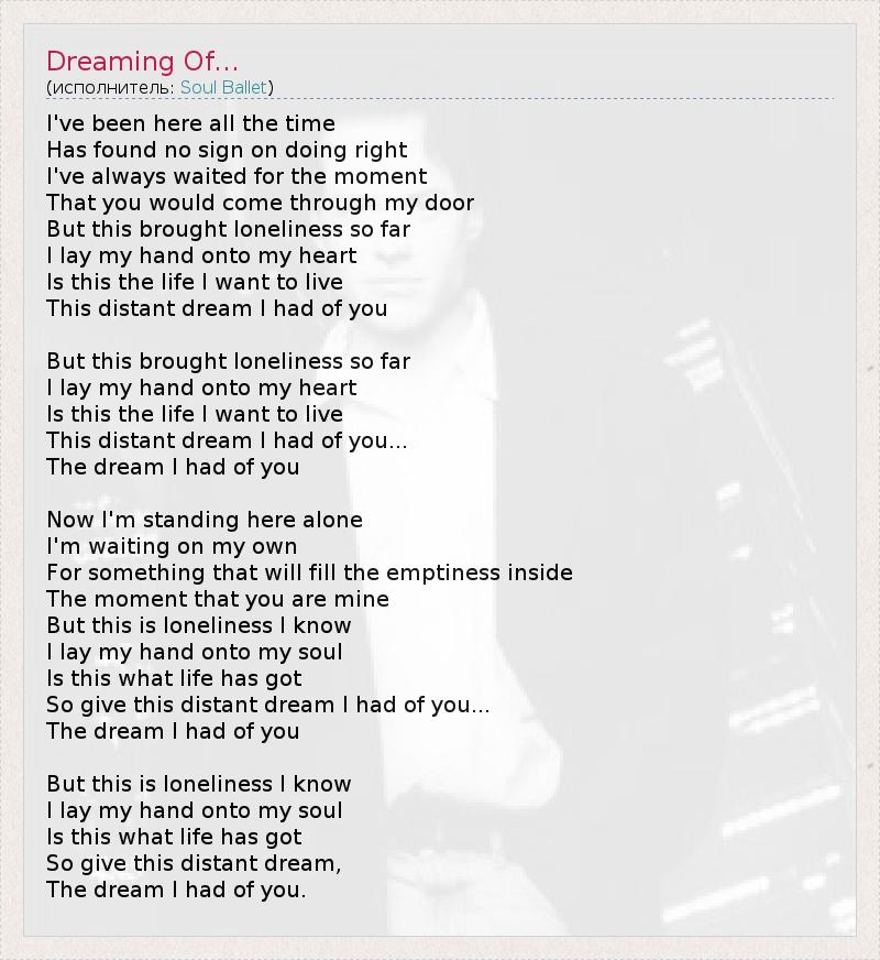 Я был здесь всё это время, Но не увидел знака, как поступить правильно. Я всегда ждал момента, Когда ты войдёшь в мою дверь, Но пока это принесло лишь одиночество. Положа руку на сердце: Неужели я так хочу прожить свою жизнь? Этой далёкой мечтой о тебе? Но пока это принесло лишь одиночество, Положа руку на сердце: Неужели я так хочу прожить свою жизнь? Этой далёкой мечтой о тебе? Мечтой о тебе... Сейчас я стою здесь один И в своём одиночестве жду того, Что заполнит пустоту внутри меня В тот момент, когда ты станешь моей... Но пока мне ведомо лишь одиночество... Положа руку на сердце: И это всё, что может предложить жизнь? Так пусть у меня будет хоть далёкая мечта о тебе, Мечта о тебе... Но пока мне ведомо лишь одиночество... Положа руку на сердце: И это всё, что может предложить жизнь? Так пусть у меня будет хоть далёкая мечта о тебе, Мечта о тебе...