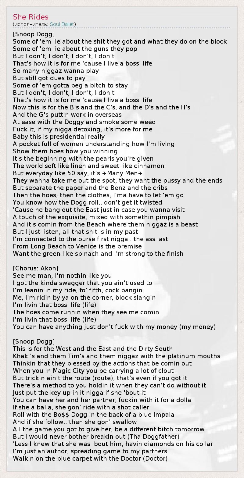 [Snoop Dogg:] Некоторые лишь придумывают, что они богатые и крутые, И сочиняют байки про то, как ловко они управляются с оружием, Но я не вру, не вру, не вру. У меня всё именно так, потому что я живу жизнью босса. Многие ниг*еры хотели бы выпендриваться, Но сначала им нужно разделаться с долгами. Некоторые из них вынуждены умолять девочек, чтобы те остались на ночь, Но не я, не я, не я. У меня всё иначе, потому что я живу жизнью босса. А это пара слов всем чувакам, Батрачащим за кордоном, Которые на короткой ноге с Догги и не прочь покурить травки: К чёрту ниг*еров, лечащихся от нар*омании, потому что нар*ота – это для меня. Детка, это действительно по-президентски: Иметь кучу женщин, знающих, с кем они имеют дело. Тёлкам нужно показывать, что ты победитель. Я подарил тебе жемчуг – и это только начало, Ты вся будешь в шелках и в шоколаде. Но 50 говорит, что таких, как я, много, И они хотят занять своё место под солнцем, хотят секса и денег, Но забери у них бабло, крутой мерс и виллы, Девочек и модный прикид – и от их крутости ничего не останется. Вы знаете, как вертится Догг, не поймите меня превратно. Я выходец гетто-школы Ист, это на случай, если вы захотите там побывать, В атмосфере утончённости с налётом безвкусия. Эта тенденция пришла с Побережья, обиталища крутых ниг*еров. Но послушай, всё это – уже в прошлом. Теперь я толстосум, первый из первых. Моя территория простирается от Лонг Бич до Венеции. Не хочу знать недостатка в бабле, хочу быть крутым до конца. [Припев: Akon] Посмотри на меня, чувак, я совсем не такой, как ты: У меня есть стиль и манеры, до которых тебе далеко. Я откидываюсь в сидении своей тачки во всеоружии, в смысле готов к сексу. Я проезжаю мимо тебя, стоящего на углу, и выражаясь по-здешнему Я живу жизнью босса. Шл*шки бегут ко мне, увидев меня издалека. Я живу жизнью босса. Делайте, что угодно, только не разбазаривайте мои денежки. [Snoop Dogg:] Это для представителей запада, востока и грязного юга, Для ниг*еров в хаки и крутых бутсах и с платиновыми улыбками – Они думают, что благословлены на всё. У себя в Атланте или Майами они имеют большое влияние, Но разводить людей на бабки не есть хорошо, даже если ты на это мастак. Есть для вас один способ, если без денег ничего не получается: Ниг*ер, просто предложи травки, если она об этом заикнётся, И за доллар ты от*меешь и её, и её подружку. Если она умница, она согласится проветриться с крутым парнем, Покувыркаться с Боссом Догги на заднем сидении Chevrolet Impala. Если она пойдёт до конца, то в итоге и проглотит, И ты отдашь ей заработанное, а на следующий день у тебя будет уже новая тёлка. Но я никогда бы не стал тратиться на бабу, Если бы не был уверен, что она запала не на мои брюллики, а на меня. Я просто сочиняю песни и делюсь мыслями с корешами, А после пожинаю плоды своей славы.