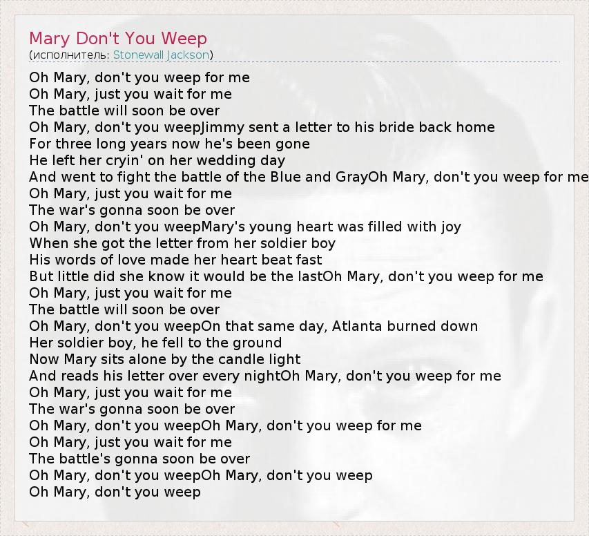 Oh Mary, don't you weepOh Mary, don't you weep for me