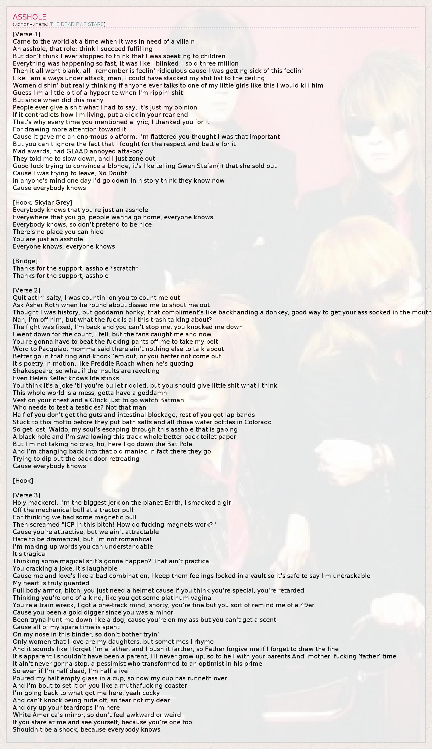 [Verse 1] Came to the world at a time when it was in need of a villain An asshole, that role; think I succeed fulfilling But don't think I ever stopped to think that I was speaking to children Everything was happening so fast, it was like I blinked – sold three million Then it all went blank, all I remember is feelin' ridiculous cause I was getting sick of this feelin' Like I am always under attack, man, I could have stacked my shit list to the ceiling Women dishin' but really thinking if anyone ever talks to one of my little girls like this I would kill him Guess I'm a little bit of a hypocrite when I'm rippin' shit But since when did this many People ever give a shit what I had to say, it's just my opinion If it contradicts how I'm living, put a dick in your rear end That's why every time you mentioned a lyric, I thanked you for it For drawing more attention toward it Cause it gave me an enormous platform, I'm flattered you thought I was that important But you can't ignore the fact that I fought for the respect and battle for it Mad awards, had GLAAD annoyed atta-boy They told me to slow down, and I just zone out Good luck trying to convince a blonde, it's like telling Gwen Stefan(i) that she sold out Cause I was trying to leave, No Doubt In anyone's mind one day I'd go down in history think they know now Cause everybody knows [Hook: Skylar Grey] Everybody knows that you're just an asshole Everywhere that you go, people wanna go home, everyone knows Everybody knows, so don't pretend to be nice There's no place you can hide You are just an asshole Everyone knows, everyone knows [Bridge] Thanks for the support, asshole *scratch* Thanks for the support, asshole [Verse 2] Quit actin' salty, I was countin' on you to count me out Ask Asher Roth when he round about dissed me to shout me out Thought I was history, but goddamn honky, that compliment's like backhanding a donkey, good way to get your ass socked in the mouth Nah, I'm off him, but what the fuck is all this trash talking about? The fight was fixed, I'm back and you can't stop me, you knocked me down I went down for the count, I fell, but the fans caught me and now You're gonna have to beat the fucking pants off me to take my belt Word to Pacquiao, momma said there ain't nothing else to talk about Better go in that ring and knock 'em out, or you better not come out It's poetry in motion, like Freddie Roach when he's quoting Shakespeare, so what if the insults are revolting Even Helen Keller knows life stinks You think it's a joke 'til you're bullet riddled, but you should give little shit what I think This whole world is a mess, gotta have a goddamn Vest on your chest and a Glock just to go watch Batman Who needs to test a testicles? Not that man Half of you don't got the guts and intestinal blockage, rest of you got lap bands Stuck to this motto before they put bath salts and all those water bottles in Colorado So get lost, Waldo, my soul's escaping through this asshole that is gaping A black hole and I'm swallowing this track whole better pack toilet paper But I'm not taking no crap, ho, here I go down the Bat Pole And I'm changing back into that old maniac in fact there they go Trying to dip out the back door retreating Cause everybody knows [Hook] [Verse 3] Holy mackerel, I'm the biggest jerk on the planet Earth, I smacked a girl Off the mechanical bull at a tractor pull For thinking we had some magnetic pull Then screamed "ICP in this bitch! How do fucking magnets work?" Cause you're attractive, but we ain't attractable Hate to be dramatical, but I'm not romantical I'm making up words you can understandable It's tragical Thinking some magical shit's gonna happen? That ain't practical You cracking a joke, it's laughable Cause me and love's like a bad combination, I keep them feelings locked in a vault so it's safe to say I'm uncrackable My heart is truly guarded Full body armor, bitch, you just need a helmet cause if you think you're special, you're retarded Thinking you're one of a kind, like you got some platinum vagina You're a train wreck, I got a one-track mind; shorty, you're fine but you sort of remind me of a 49er Cause you been a gold digger since you was a minor Been tryna hunt me down like a dog, cause you're on my ass but you can't get a scent Cause all of my spare time is spent On my nose in this binder, so don't bother tryin' Only women that I love are my daughters, but sometimes I rhyme And it sounds like I forget I'm a father, and I push it farther, so Father forgive me if I forget to draw the line It's apparent I shouldn't have been a parent, I'll never grow up, so to hell with your parents And 'mother' fucking 'father' time It ain't never gonna stop, a pessimist who transformed to an optimist in his prime So even if I'm half dead, I'm half alive Poured my half empty glass in a cup, so now my cup has runneth over And I'm bout to set it on you like a muthafucking coaster I'm going back to what got me here, yeah cocky And can't knock being rude off, so fear not my dear And dry up your teardrops I'm here White America's mirror, so don't feel awkward or weird If you stare at me and see yourself, because you're one too Shouldn't be a shock, because everybody knows