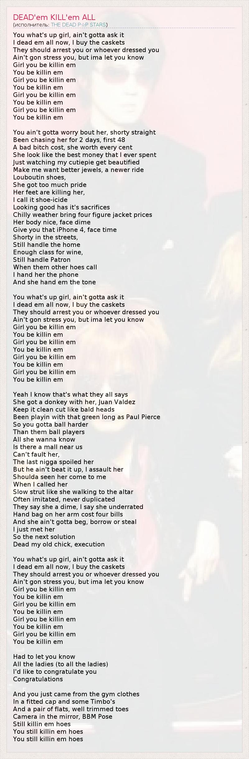 You what's up girl, ain't gotta ask it I dead em all now, I buy the caskets They should arrest you or whoever dressed you Ain't gon stress you, but ima let you know Girl you be killin em You be killin em Girl you be killin em You be killin em Girl you be killin em You be killin em Girl you be killin em You be killin em You ain't gotta worry bout her, shorty straight Been chasing her for 2 days, first 48 A bad bitch cost, she worth every cent She look like the best money that I ever spent Just watching my cutiepie get beautified Make me want better jewels, a newer ride Louboutin shoes, She got too much pride Her feet are killing her, I call it shoe-icide Looking good has it's sacrifices Chilly weather bring four figure jacket prices Her body nice, face dime Give you that iPhone 4, face time Shorty in the streets, Still handle the home Enough class for wine, Still handle Patron When them other hoes call I hand her the phone And she hand em the tone You what's up girl, ain't gotta ask it I dead em all now, I buy the caskets They should arrest you or whoever dressed you Ain't gon stress you, but ima let you know Girl you be killin em You be killin em Girl you be killin em You be killin em Girl you be killin em You be killin em Girl you be killin em You be killin em Yeah I know that's what they all says She got a donkey with her, Juan Valdez Keep it clean cut like bald heads Been playin with that green long as Paul Pierce So you gotta ball harder Than them ball players All she wanna know Is there a mall near us Can't fault her, The last nigga spoiled her But he ain't beat it up, I assault her Shoulda seen her come to me When I called her Slow strut like she walking to the altar Often imitated, never duplicated They say she a dime, I say she underrated Hand bag on her arm cost four bills And she ain't gotta beg, borrow or steal I just met her So the next solution Dead my old chick, execution You what's up girl, ain't gotta ask it I dead em all now, I buy the caskets They should arrest you or whoever dressed you Ain't gon stress you, but ima let you know Girl you be killin em You be killin em Girl you be killin em You be killin em Girl you be killin em You be killin em Girl you be killin em You be killin em Had to let you know All the ladies (to all the ladies) I'd like to congratulate you Congratulations And you just came from the gym clothes In a fitted cap and some Timbo's And a pair of flats, well trimmed toes Camera in the mirror, BBM Pose Still killin em hoes You still killin em hoes You still killin em hoes