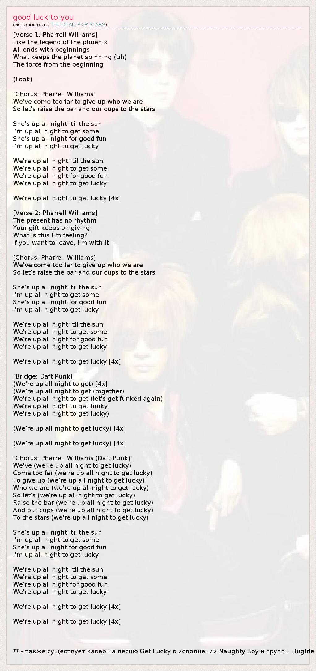 [Verse 1: Pharrell Williams] Like the legend of the phoenix All ends with beginnings What keeps the planet spinning (uh) The force from the beginning (Look) [Chorus: Pharrell Williams] We've come too far to give up who we are So let's raise the bar and our cups to the stars She's up all night 'til the sun I'm up all night to get some She's up all night for good fun I'm up all night to get lucky We're up all night 'til the sun We're up all night to get some We're up all night for good fun We're up all night to get lucky We're up all night to get lucky [4x] [Verse 2: Pharrell Williams] The present has no rhythm Your gift keeps on giving What is this I'm feeling? If you want to leave, I'm with it [Chorus: Pharrell Williams] We've come too far to give up who we are So let's raise the bar and our cups to the stars She's up all night 'til the sun I'm up all night to get some She's up all night for good fun I'm up all night to get lucky We're up all night 'til the sun We're up all night to get some We're up all night for good fun We're up all night to get lucky We're up all night to get lucky [4x] [Bridge: Daft Punk] (We're up all night to get) [4x] (We're up all night to get (together) We're up all night to get (let's get funked again) We're up all night to get funky We're up all night to get lucky) (We're up all night to get lucky) [4x] (We're up all night to get lucky) [4x] [Chorus: Pharrell Williams (Daft Punk)] We've (we're up all night to get lucky) Come too far (we're up all night to get lucky) To give up (we're up all night to get lucky) Who we are (we're up all night to get lucky) So let's (we're up all night to get lucky) Raise the bar (we're up all night to get lucky) And our cups (we're up all night to get lucky) To the stars (we're up all night to get lucky) She's up all night 'til the sun I'm up all night to get some She's up all night for good fun I'm up all night to get lucky We're up all night 'til the sun We're up all night to get some We're up all night for good fun We're up all night to get lucky We're up all night to get lucky [4x] We're up all night to get lucky [4x] ** - также существует кавер на песню Get Lucky в исполнении Naughty Boy и группы Huglife.