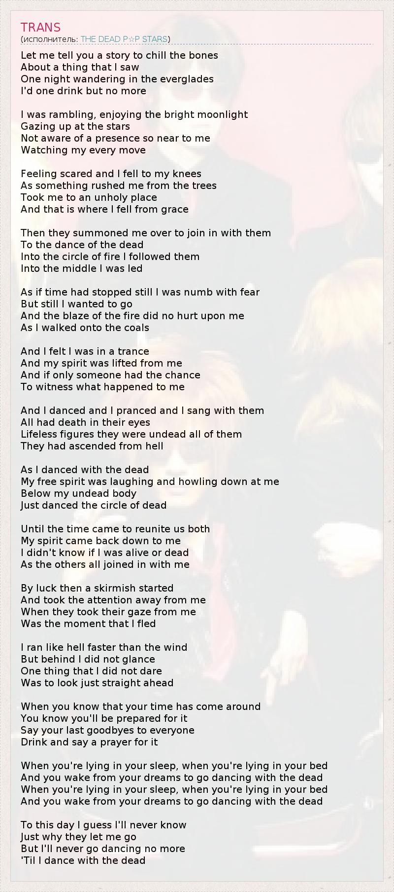 Позвольте рассказать вам историю, пробирающую до костей, О том, что я увидел Одной ночью, блуждая по болотам... Тогда я выпил одну бутылку, но не более того. Я околачивался там, наслаждаясь ярким лунным светом, Глазея на звёзды, Не подозревая, что кто-то около меня Наблюдает за каждым моим движением. Испугавшись, я упал на колени, Так как нечто бросилось на меня с деревьев И унесло в зловещее место – Я лишился Божьей благодати... Затем они позвали меня присоединиться К танцу мертвецов, Я последовал за ними в огненный круг, Они привели меня в середину. Время будто остановилось, я оцепенел от страха, Но несмотря на это, мне хотелось идти, И пламя огня не причиняло мне вреда, Хотя я шёл по углям. Я ощущал себя словно в трансе, И мой дух вышел из меня, И если бы хоть кто-нибудь имел шанс Засвидетельствовать то, что со мной произошло. И я танцевал, гарцевал, пел вместе с ними, У них у всех смерть была в глазах. Безжизненные фигуры, каждый из них был нежитью, Восставшие из ада. Пока я танцевал с мертвецами, Мой свободный дух смеялся и заглушал меня своим воем. Под ним моё зомбированное тело Танцевало в кругу мертвецов. Ещё до того момента, когда нам следовало воссоединиться, Мой дух вернулся ко мне. Я не понимал, жив я или мёртв, Как и все остальные, присоединившиеся ко мне. Но на моё везение, началась перепалка, И она отвлекла их внимание. Когда они отвели свой пристальный взгляд от меня, Я, воспользовавшись моментом, сбежал. Я бежал изо всех сил, быстрее ветра, Не оглядываясь назад – На это у меня не хватало смелости. Я смотрел только вперёд. Когда вы поймёте, что ваше время пришло, Вы знаете, что будете к этому готовы. Скажите всем последнее «прощай», Выпейте и помолитесь за них. Когда вы спите, лёжа в своей постели, Вы просыпаетесь и идёте танцевать с мертвецами. Когда вы спите, лёжа в своей постели, Вы просыпаетесь и идёте танцевать с мертвецами. И по сей день, мне кажется, я никогда не узнаю, Почему они отпустили меня. Но я больше никогда не пойду танцевать, После того, как танцевал с мертвецами.