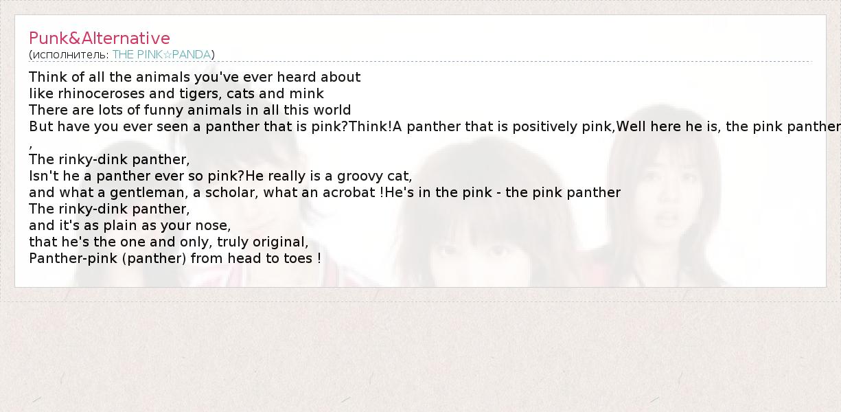 Think of all the animals you've ever heard about like rhinoceroses and tigers, cats and mink There are lots of funny animals in all this world But have you ever seen a panther that is pink?Think!A panther that is positively pink,Well here he is, the pink panther , The rinky-dink panther, Isn't he a panther ever so pink?He really is a groovy cat, and what a gentleman, a scholar, what an acrobat !He's in the pink - the pink panther The rinky-dink panther, and it's as plain as your nose, that he's the one and only, truly original, Panther-pink (panther) from head to toes !