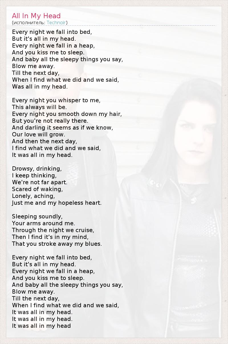 Каждую ночь мы падаем на кровать, Но это все в моей голове. Каждую ночь мы ложимся вместе, И ты целуешь меня перед сном. И, милый, все эти убаюкивающие вещи, что ты говоришь, Уносят меня далеко, До следующего дня, Пока я не пойму, что все, что мы делали и мы говорили, Было только в моей голове. Каждую ночь ты шепчешь мне, Что так будет всегда. Каждую ночь ты гладишь меня по волосам, Но тебя нет рядом. И, милый, мне кажется, что мы знаем, Что наша любовь будет ещё сильнее, А на следующий день Я знаю, что все, что мы делали и говорили, Было только в моей голове. Сонная, пьяная, Я продолжаю думать, Что мы не далеко друг от друга. Боюсь проснуться, Одинокая, с болью, Только я и мое безнадежное сердце. Когда я беспробудно сплю, Твои руки обнимают меня. Мы плывем сквозь ночь, Потом я узнаю, что только в моем разуме, Ты развеял мою грусть. Каждую ночь мы падаем на кровать, Но это все в моей голове. Каждую ночь мы ложимся вместе, И ты целуешь меня перед сном. И, милый, все эти убаюкивающие вещи, что ты говоришь Уносят меня далеко До следующего дня, Пока я не узнаю, что все, что мы делали и мы говорили, Было только в моей голове. Было только в моей голове. Было только в моей голове.