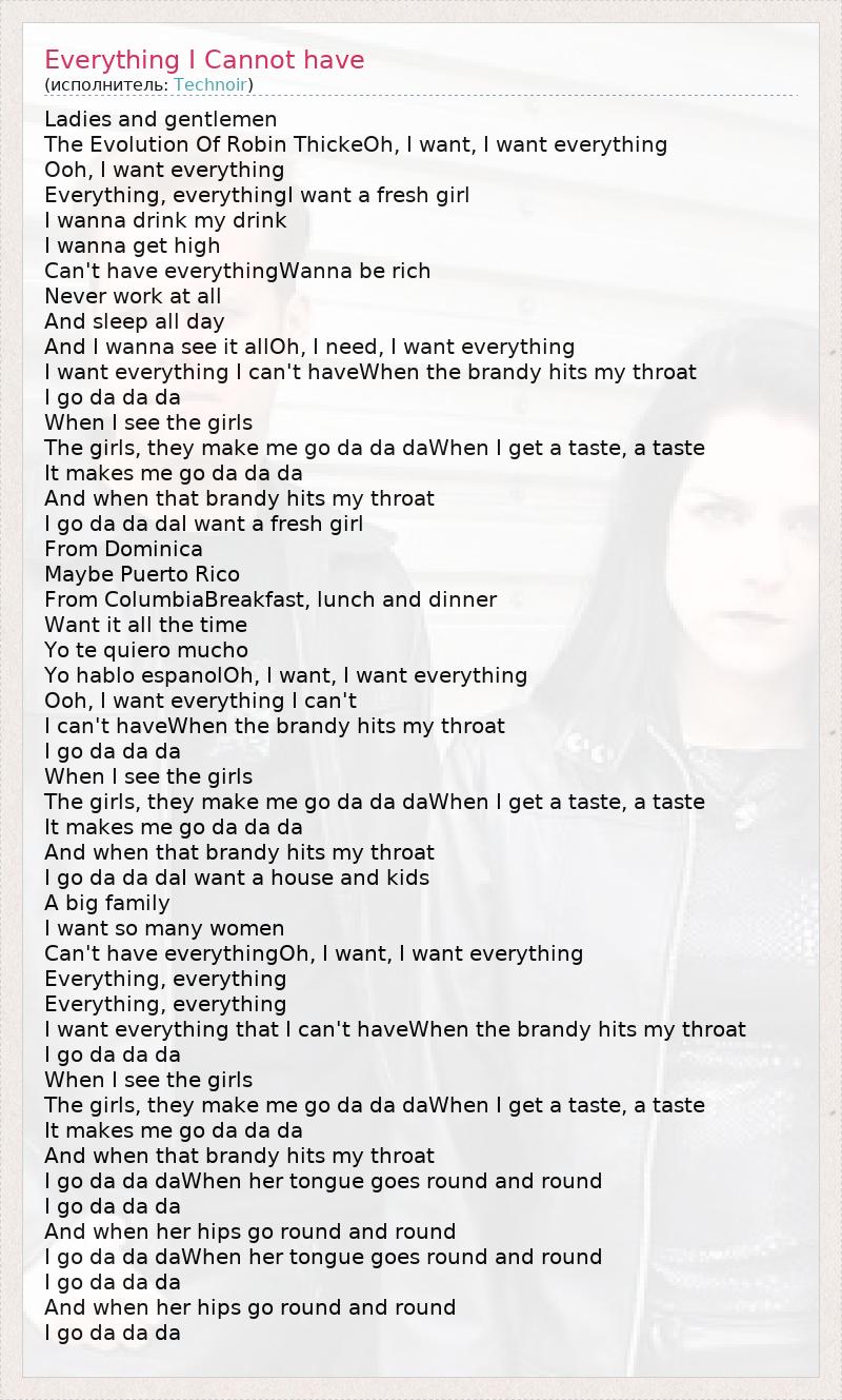 Ladies and gentlemen The Evolution Of Robin ThickeOh, I want, I want everything Ooh, I want everything Everything, everythingI want a fresh girl I wanna drink my drink I wanna get high Can't have everythingWanna be rich Never work at all And sleep all day And I wanna see it allOh, I need, I want everything I want everything I can't haveWhen the brandy hits my throat I go da da da When I see the girls The girls, they make me go da da daWhen I get a taste, a taste It makes me go da da da And when that brandy hits my throat I go da da daI want a fresh girl From Dominica Maybe Puerto Rico From ColumbiaBreakfast, lunch and dinner Want it all the time Yo te quiero mucho Yo hablo espanolOh, I want, I want everything Ooh, I want everything I can't I can't haveWhen the brandy hits my throat I go da da da When I see the girls The girls, they make me go da da daWhen I get a taste, a taste It makes me go da da da And when that brandy hits my throat I go da da daI want a house and kids A big family I want so many women Can't have everythingOh, I want, I want everything Everything, everything Everything, everything I want everything that I can't haveWhen the brandy hits my throat I go da da da When I see the girls The girls, they make me go da da daWhen I get a taste, a taste It makes me go da da da And when that brandy hits my throat I go da da daWhen her tongue goes round and round I go da da da And when her hips go round and round I go da da daWhen her tongue goes round and round I go da da da And when her hips go round and round I go da da da