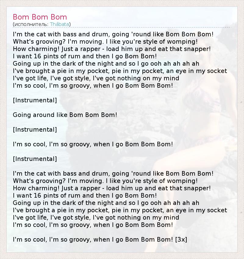 I'm the cat with bass and drum, going 'round like Bom Bom Bom! What's grooving? I'm moving. I like you're style of womping! How charming! Just a rapper - load him up and eat that snapper! I want 16 pints of rum and then I go Bom Bom! Going up in the dark of the night and so I go ooh ah ah ah ah I've brought a pie in my pocket, pie in my pocket, an eye in my socket I've got life, I've got style, I've got nothing on my mind I'm so cool, I'm so groovy, when I go Bom Bom Bom! [Instrumental] Going around like Bom Bom Bom! [Instrumental] I'm so cool, I'm so groovy, when I go Bom Bom Bom! [Instrumental] I'm the cat with bass and drum, going 'round like Bom Bom Bom! What's grooving? I'm moving. I like you're style of womping! How charming! Just a rapper - load him up and eat that snapper! I want 16 pints of rum and then I go Bom Bom! Going up in the dark of the night and so I go ooh ah ah ah ah I've brought a pie in my pocket, pie in my pocket, an eye in my socket I've got life, I've got style, I've got nothing on my mind I'm so cool, I'm so groovy, when I go Bom Bom Bom! I'm so cool, I'm so groovy, when I go Bom Bom Bom! [3x]