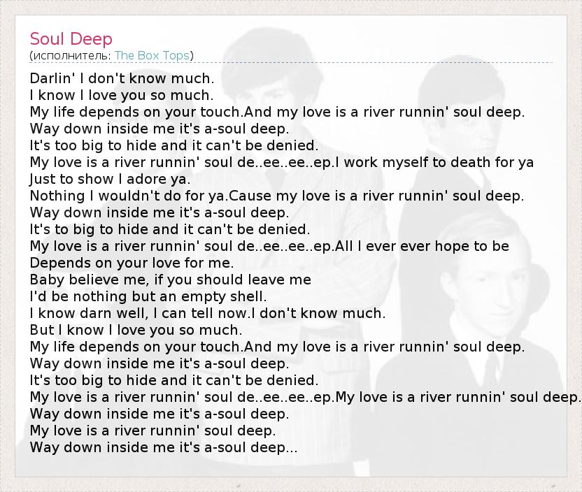 Darlin' I don't know much. I know I love you so much. My life depends on your touch.And my love is a river runnin' soul deep. Way down inside me it's a-soul deep. It's too big to hide and it can't be denied. My love is a river runnin' soul de..ee..ee..ep.I work myself to death for ya Just to show I adore ya. Nothing I wouldn't do for ya.Cause my love is a river runnin' soul deep. Way down inside me it's a-soul deep. It's to big to hide and it can't be denied. My love is a river runnin' soul de..ee..ee..ep.All I ever ever hope to be Depends on your love for me. Baby believe me, if you should leave me I'd be nothing but an empty shell. I know darn well, I can tell now.I don't know much. But I know I love you so much. My life depends on your touch.And my love is a river runnin' soul deep. Way down inside me it's a-soul deep. It's too big to hide and it can't be denied. My love is a river runnin' soul de..ee..ee..ep.My love is a river runnin' soul deep. Way down inside me it's a-soul deep. My love is a river runnin' soul deep. Way down inside me it's a-soul deep...