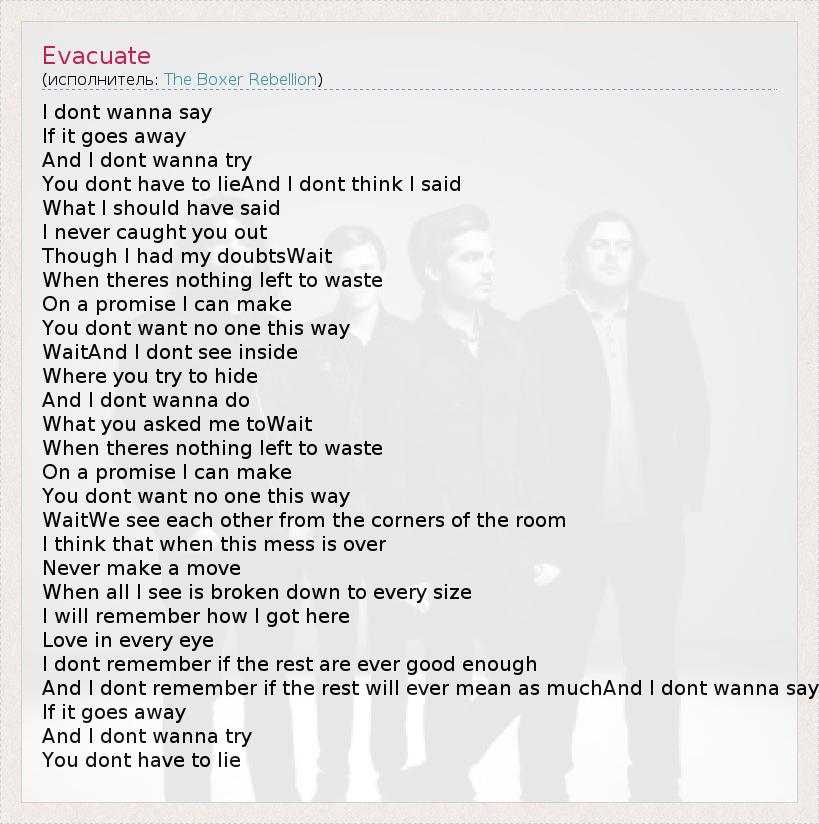 I dont wanna say If it goes away And I dont wanna try You dont have to lieAnd I dont think I said What I should have said I never caught you out Though I had my doubtsWait When theres nothing left to waste On a promise I can make You dont want no one this way WaitAnd I dont see inside Where you try to hide And I dont wanna do What you asked me toWait When theres nothing left to waste On a promise I can make You dont want no one this way WaitWe see each other from the corners of the room I think that when this mess is over Never make a move When all I see is broken down to every size I will remember how I got here Love in every eye I dont remember if the rest are ever good enough And I dont remember if the rest will ever mean as muchAnd I dont wanna say If it goes away And I dont wanna try You dont have to lie