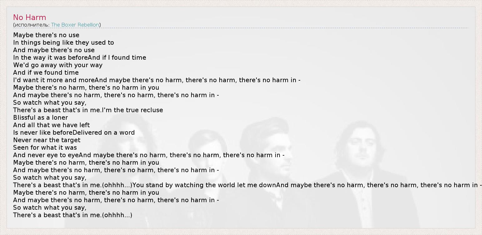 Maybe there's no use In things being like they used to And maybe there's no use In the way it was beforeAnd if I found time We'd go away with your way And if we found time I'd want it more and moreAnd maybe there's no harm, there's no harm, there's no harm in - Maybe there's no harm, there's no harm in you And maybe there's no harm, there's no harm, there's no harm in - So watch what you say, There's a beast that's in me.I'm the true recluse Blissful as a loner And all that we have left Is never like beforeDelivered on a word Never near the target Seen for what it was And never eye to eyeAnd maybe there's no harm, there's no harm, there's no harm in - Maybe there's no harm, there's no harm in you And maybe there's no harm, there's no harm, there's no harm in - So watch what you say, There's a beast that's in me.(ohhhh...)You stand by watching the world let me downAnd maybe there's no harm, there's no harm, there's no harm in - Maybe there's no harm, there's no harm in you And maybe there's no harm, there's no harm, there's no harm in - So watch what you say, There's a beast that's in me.(ohhhh...)