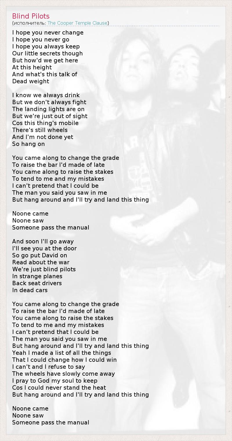 I hope you never change I hope you never go I hope you always keep Our little secrets though But how'd we get here At this height And what's this talk of Dead weight I know we always drink But we don't always fight The landing lights are on But we're just out of sight Cos this thing's mobile There's still wheels And I'm not done yet So hang on You came along to change the grade To raise the bar I'd made of late You came along to raise the stakes To tend to me and my mistakes I can't pretend that I could be The man you said you saw in me But hang around and I'll try and land this thing Noone came Noone saw Someone pass the manual And soon I'll go away I'll see you at the door So go put David on Read about the war We're just blind pilots In strange planes Back seat drivers In dead cars You came along to change the grade To raise the bar I'd made of late You came along to raise the stakes To tend to me and my mistakes I can't pretend that I could be The man you said you saw in me But hang around and I'll try and land this thing Yeah I made a list of all the things That I could change how I could win I can't and I refuse to say The wheels have slowly come away I pray to God my soul to keep Cos I could never stand the heat But hang around and I'll try and land this thing Noone came Noone saw Someone pass the manual
