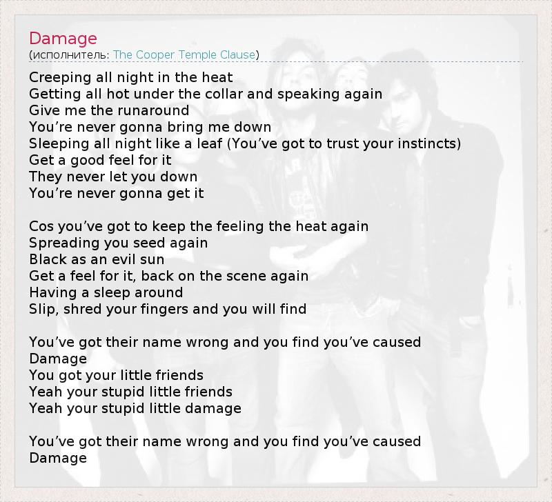 Creeping all night in the heat Getting all hot under the collar and speaking again Give me the runaround You’re never gonna bring me down Sleeping all night like a leaf (You’ve got to trust your instincts) Get a good feel for it They never let you down You’re never gonna get it Cos you’ve got to keep the feeling the heat again Spreading you seed again Black as an evil sun Get a feel for it, back on the scene again Having a sleep around Slip, shred your fingers and you will find You’ve got their name wrong and you find you’ve caused Damage You got your little friends Yeah your stupid little friends Yeah your stupid little damage You’ve got their name wrong and you find you’ve caused Damage