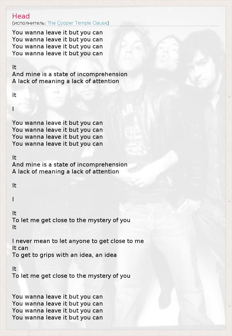 You wanna leave it but you can You wanna leave it but you can You wanna leave it but you can You wanna leave it but you can It And mine is a state of incomprehension A lack of meaning a lack of attention It I You wanna leave it but you can You wanna leave it but you can You wanna leave it but you can You wanna leave it but you can It And mine is a state of incomprehension A lack of meaning a lack of attention It I It To let me get close to the mystery of you It I never mean to let anyone to get close to me It can To get to grips with an idea, an idea It To let me get close to the mystery of you You wanna leave it but you can You wanna leave it but you can You wanna leave it but you can You wanna leave it but you can