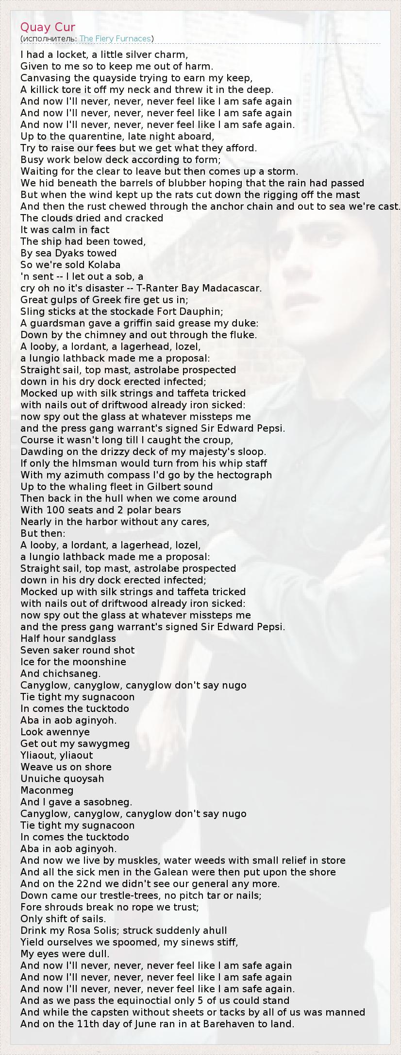 I had a locket, a little silver charm, Given to me so to keep me out of harm. Canvasing the quayside trying to earn my keep, A killick tore it off my neck and threw it in the deep. And now I'll never, never, never feel like I am safe again And now I'll never, never, never feel like I am safe again And now I'll never, never, never feel like I am safe again. Up to the quarentine, late night aboard, Try to raise our fees but we get what they afford. Busy work below deck according to form; Waiting for the clear to leave but then comes up a storm. We hid beneath the barrels of blubber hoping that the rain had passed But when the wind kept up the rats cut down the rigging off the mast And then the rust chewed through the anchor chain and out to sea we're cast. The clouds dried and cracked It was calm in fact The ship had been towed, By sea Dyaks towed So we're sold Kolaba 'n sent -- I let out a sob, a cry oh no it's disaster -- T-Ranter Bay Madacascar. Great gulps of Greek fire get us in; Sling sticks at the stockade Fort Dauphin; A guardsman gave a griffin said grease my duke: Down by the chimney and out through the fluke. A looby, a lordant, a lagerhead, lozel, a lungio lathback made me a proposal: Straight sail, top mast, astrolabe prospected down in his dry dock erected infected; Mocked up with silk strings and taffeta tricked with nails out of driftwood already iron sicked: now spy out the glass at whatever missteps me and the press gang warrant's signed Sir Edward Pepsi. Course it wasn't long till I caught the croup, Dawding on the drizzy deck of my majesty's sloop. If only the hlmsman would turn from his whip staff With my azimuth compass I'd go by the hectograph Up to the whaling fleet in Gilbert sound Then back in the hull when we come around With 100 seats and 2 polar bears Nearly in the harbor without any cares, But then: A looby, a lordant, a lagerhead, lozel, a lungio lathback made me a proposal: Straight sail, top mast, astrolabe prospected down in his dry dock erected infected; Mocked up with silk strings and taffeta tricked with nails out of driftwood already iron sicked: now spy out the glass at whatever missteps me and the press gang warrant's signed Sir Edward Pepsi. Half hour sandglass Seven saker round shot Ice for the moonshine And chichsaneg. Canyglow, canyglow, canyglow don't say nugo Tie tight my sugnacoon In comes the tucktodo Aba in aob aginyoh. Look awennye Get out my sawygmeg Yliaout, yliaout Weave us on shore Unuiche quoysah Maconmeg And I gave a sasobneg. Canyglow, canyglow, canyglow don't say nugo Tie tight my sugnacoon In comes the tucktodo Aba in aob aginyoh. And now we live by muskles, water weeds with small relief in store And all the sick men in the Galean were then put upon the shore And on the 22nd we didn't see our general any more. Down came our trestle-trees, no pitch tar or nails; Fore shrouds break no rope we trust; Only shift of sails. Drink my Rosa Solis; struck suddenly ahull Yield ourselves we spoomed, my sinews stiff, My eyes were dull. And now I'll never, never, never feel like I am safe again And now I'll never, never, never feel like I am safe again And now I'll never, never, never feel like I am safe again. And as we pass the equinoctial only 5 of us could stand And while the capsten without sheets or tacks by all of us was manned And on the 11th day of June ran in at Barehaven to land.